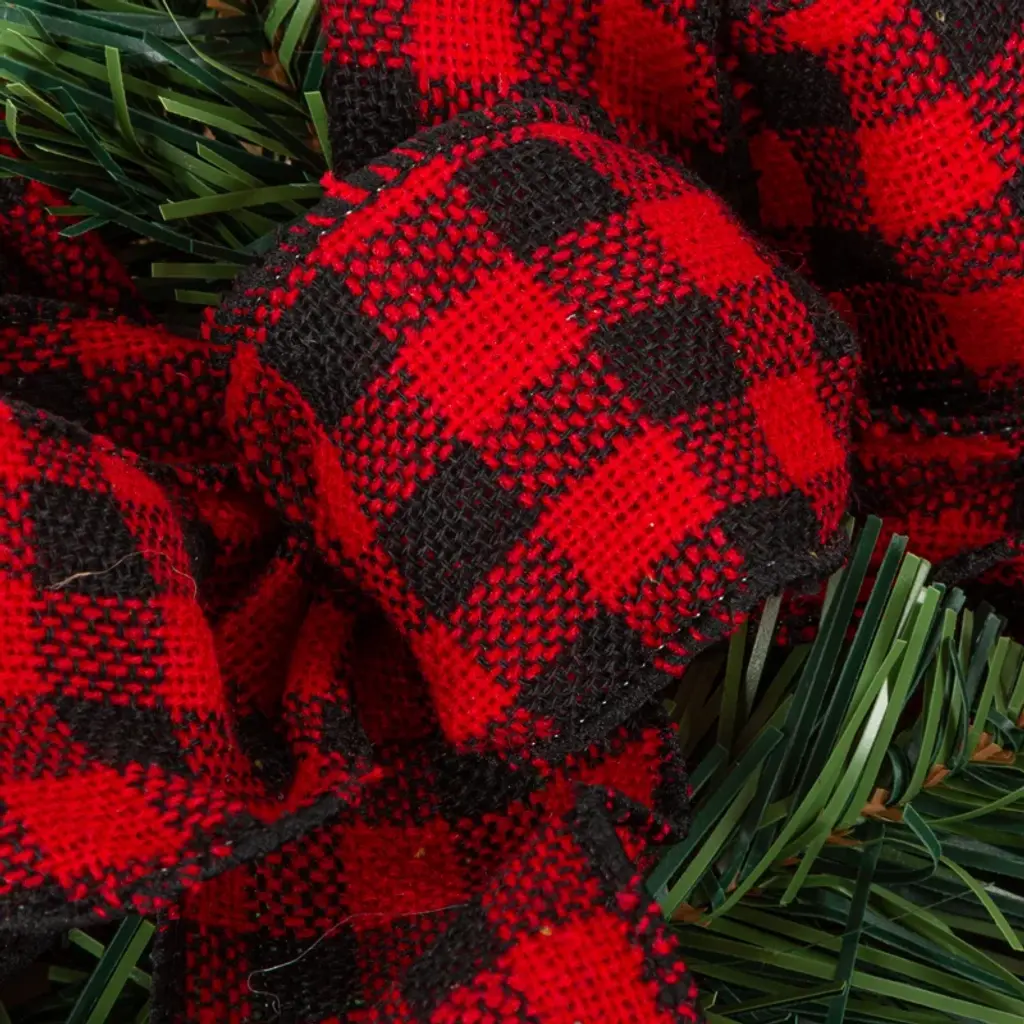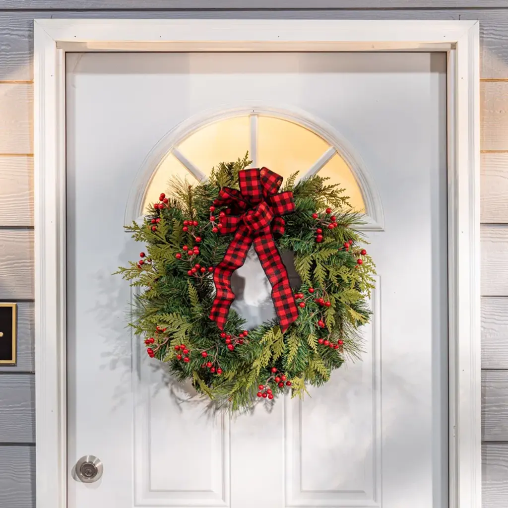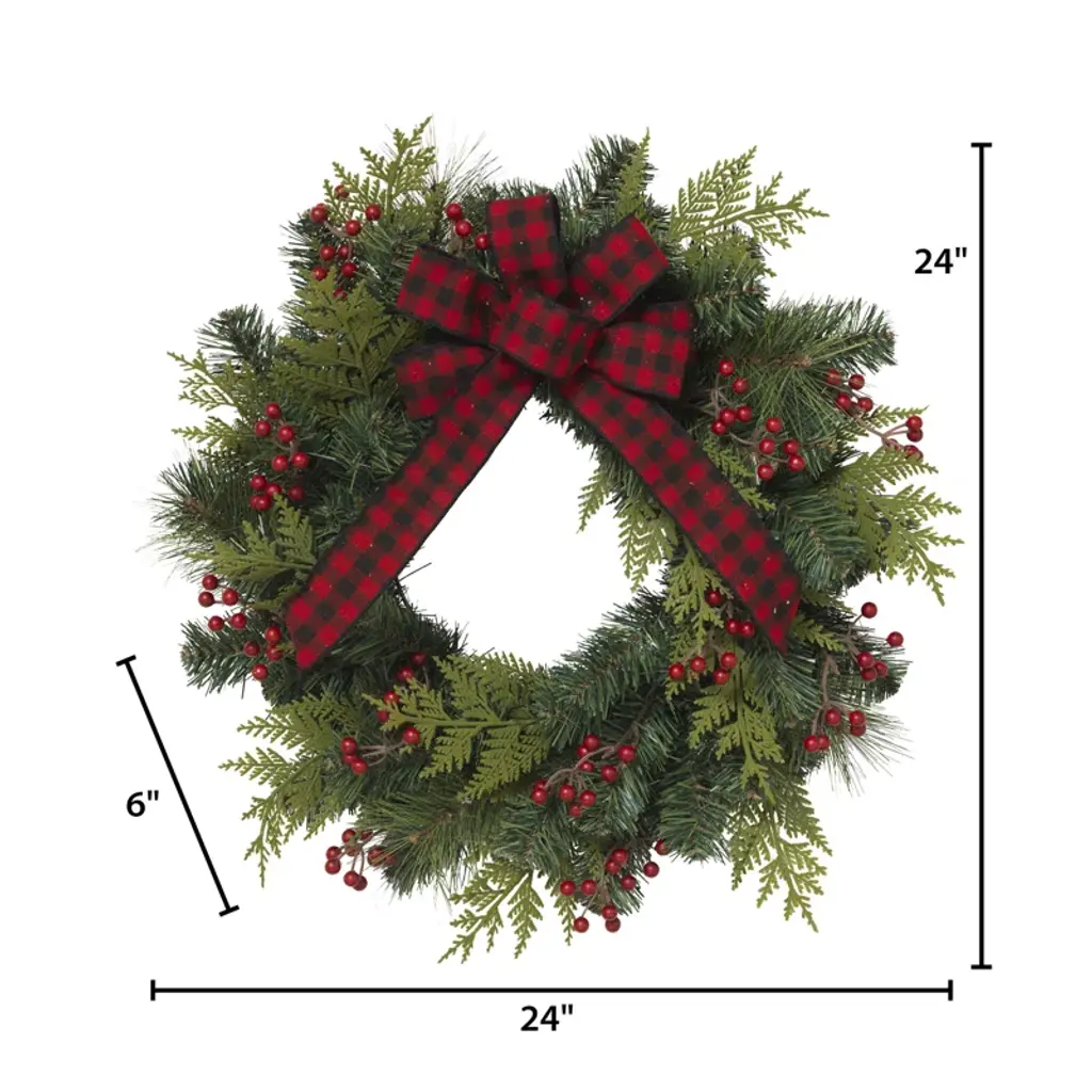 This wreath of faux pine accented berries is a perfect representation of the season. Topped with a red and black buffalo plaid ribbon loop bow. You will be sure to get lots of compliments when you display this seasonal wreath!