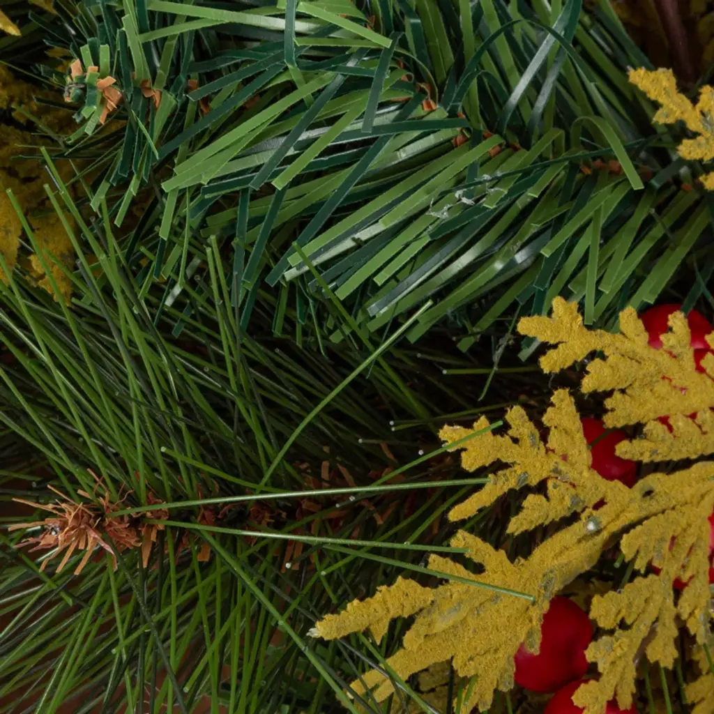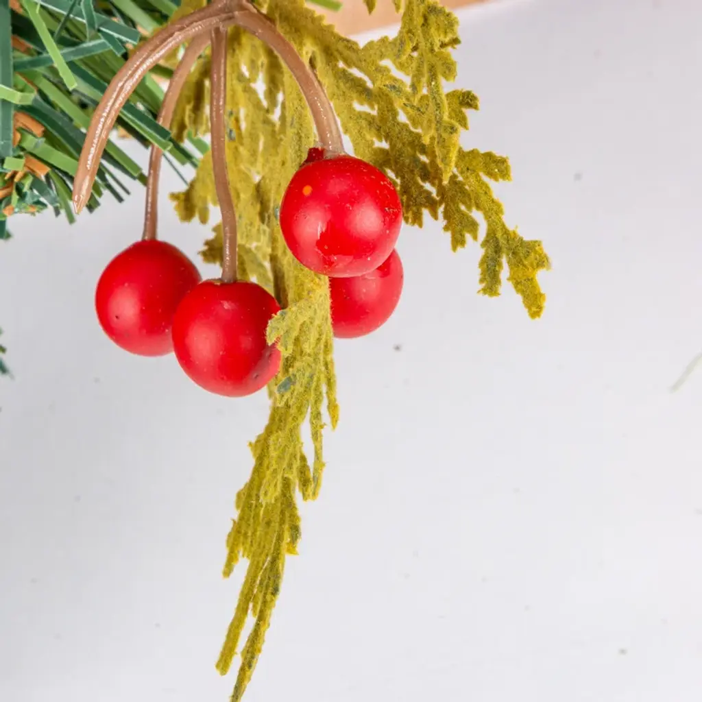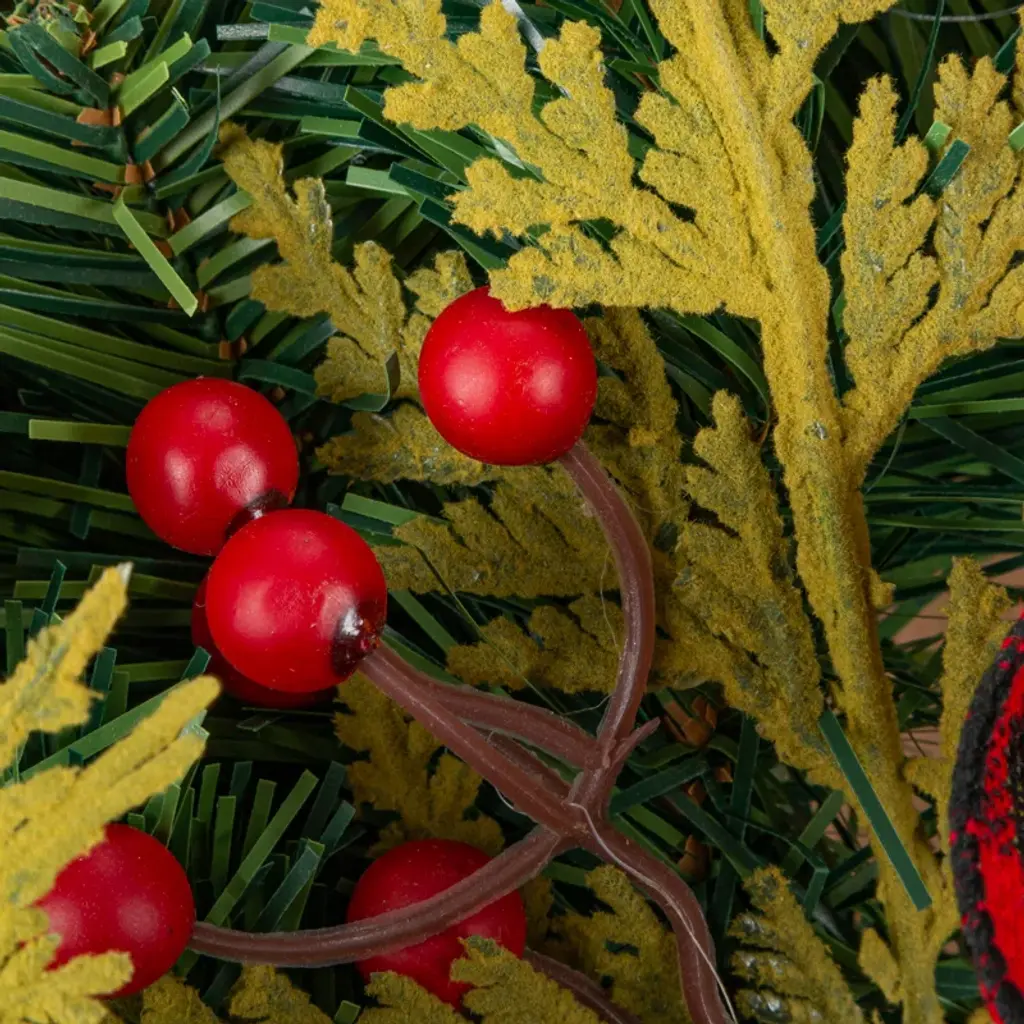 This wreath of faux pine accented berries is a perfect representation of the season. Topped with a red and black buffalo plaid ribbon loop bow. You will be sure to get lots of compliments when you display this seasonal wreath!