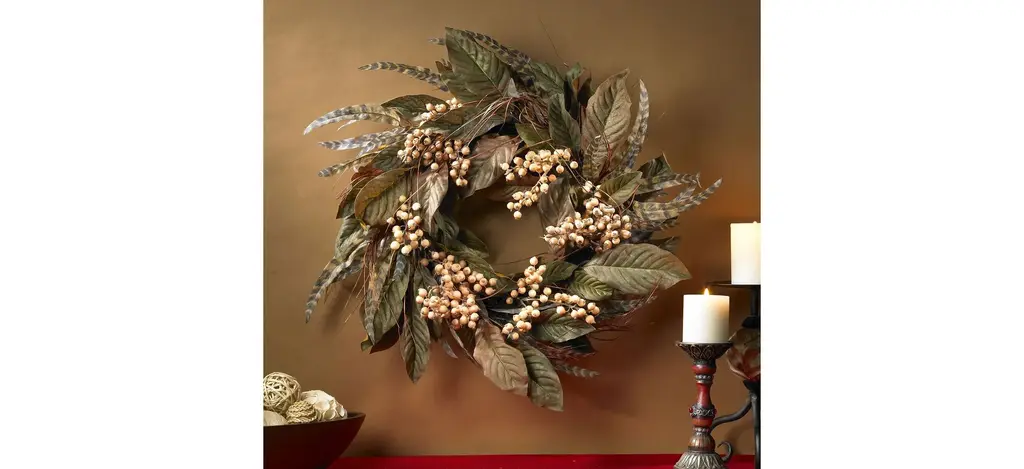 Show off your unique "Autumn" flair with this Berry and feather creation. An eclectic twist from a traditional style wreath, this circular masterpiece is sure to turn heads. Creamy pastel berries surrounded by radiant striped feathers lend a fun whimsical touch to your home or office, and the crisp green foliage adds a spark of rustic appeal. Twenty-four inches in diameter, this stunning wreath makes a bold statement in any environment.