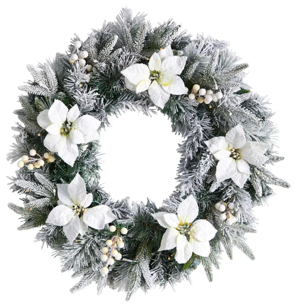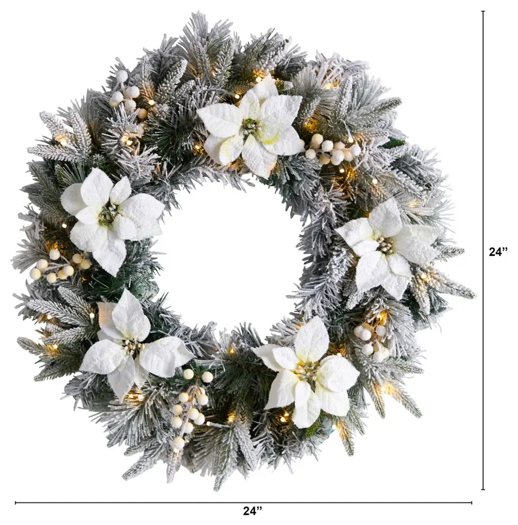 24" Flocked Poinsettia And Pine Faux Christmas Wreath With 50 White Led Lights