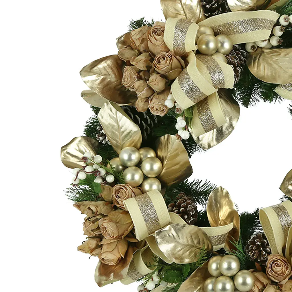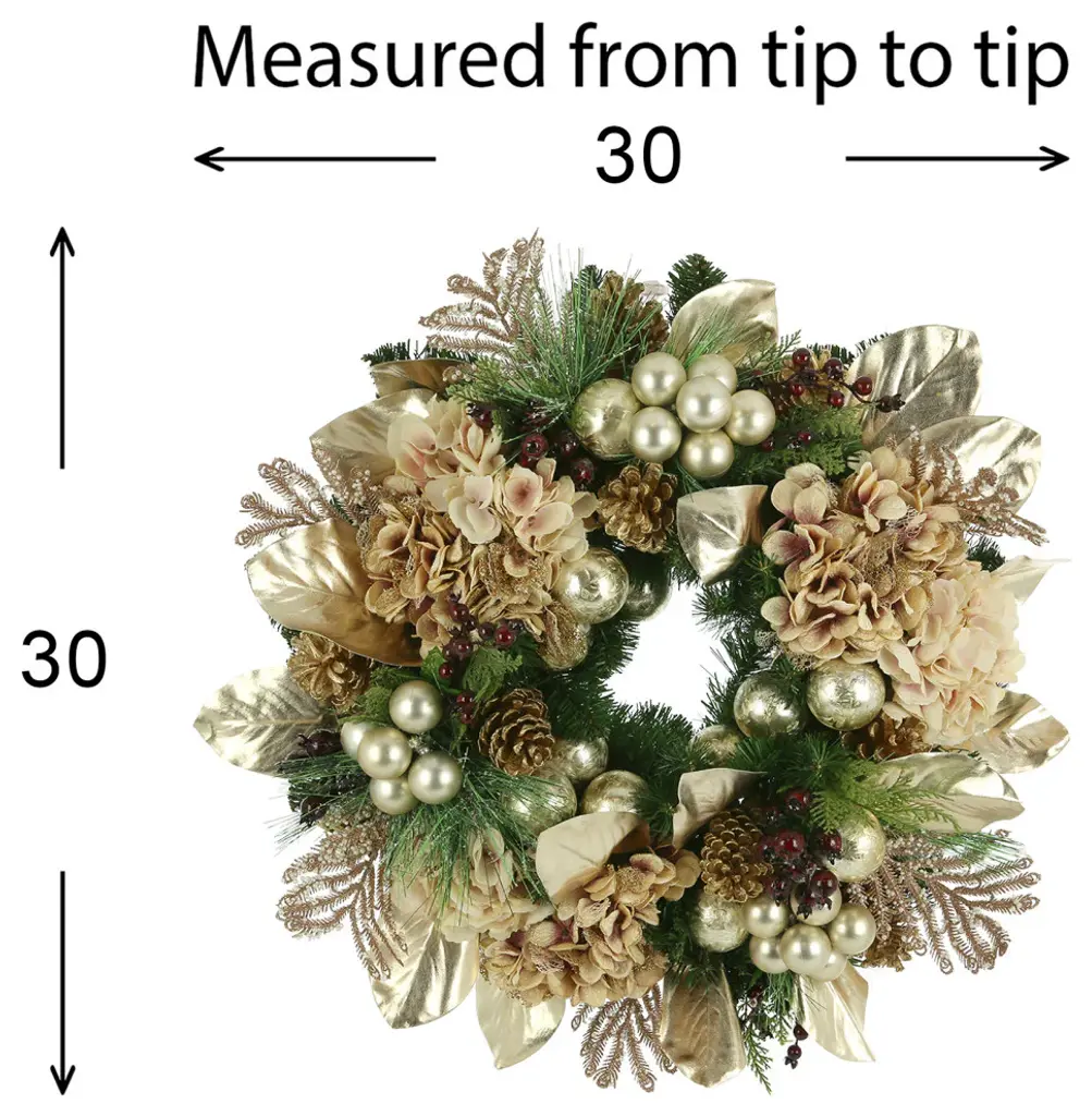 Realistic artificial pine wreath is beautifully decorated with gold pine cones glitter embellished fabric poinsettias ball ornaments and holly berriesAccented with long needle pine throughoutProduct Features:UnlitTips feature bendable wire for easy shaping to help accommodate your decorating needsNo assembly required - wreath comes in 1 pieceFor indoor use onlyIncludes a heavy duty ring metal frame backing for hangingDimensions: 24" diameter (measured from outermost tip to the opposite side''s outermost tip)Material(s): PVC/plastic/foam/metal/fabric/pine cones