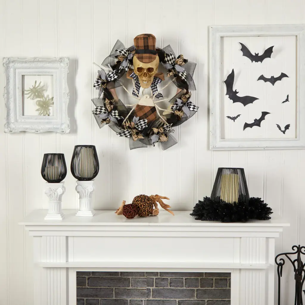 You can still be scary but chic at the same time with this Skull and Ribbons Halloween Wreath. Ribbons are accented by a skeleton with a top hat and a spider with the same patterned hat, bring a fun yet festive look in any space. With a diameter of 24in. hang in any bare wall or door. Perfect as a gift or for a fun spooky night at home. Artificial wreaths are manufactured using synthetic materials, such as polyester material or plastic, and are well designed and constructed to be life-like in appearance. This item will need to be re-shaped when removed from the secure box to allow it to reach its fullest size. Your wreath will look beautiful for years to come; simply wipe clean with a soft dry cloth when needed.