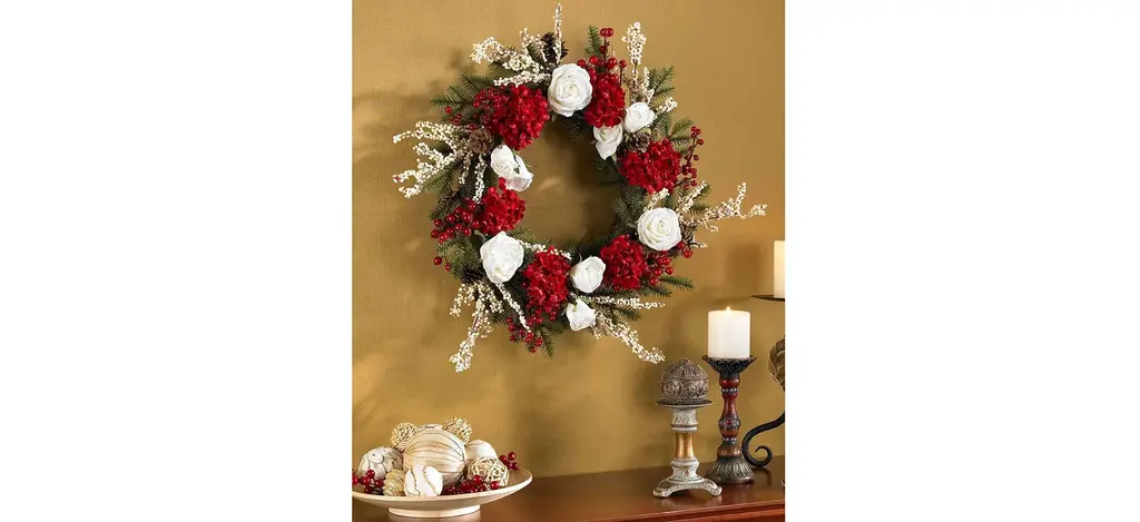 Alternating blooms of fire and ice adorn this lovely holiday sensation. A blend of delicately crafted berries sprouts forth from behind plush petals. The entire circumference of this gorgeous diadem is covered with lush green foliage creating a stunning design that's second to none. At twenty four inches in diameter, this cheery, attractive wreath makes a splendid addition to your home or office d_cor.