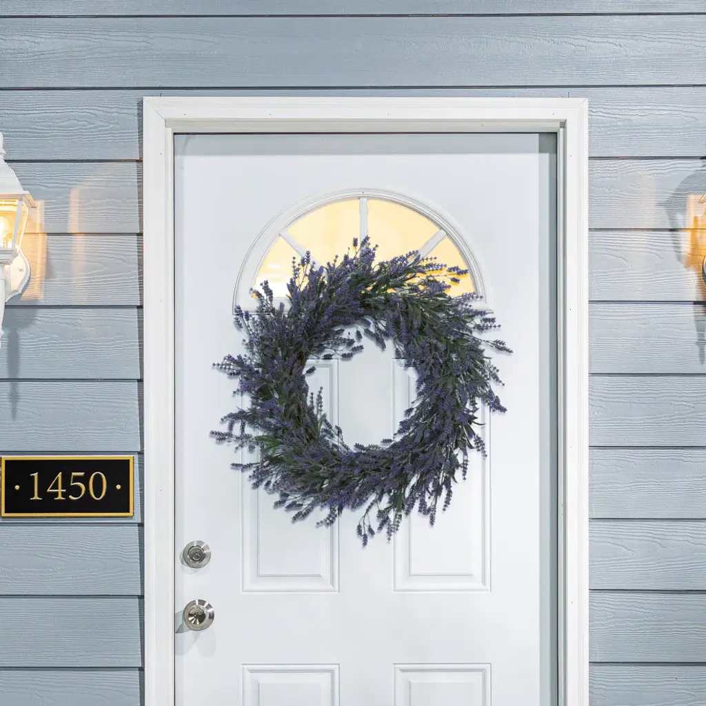 If you love lavender this is the wreath for you. Hang indoors or on your front door to welcome guests. The natural looking faux lavender wreath measures 24 inches in diameter. Add your own touches to this wreath to make it one of a kind. This wreath is made of plastic and twig making it perfect for indoor and covered outdoor use.