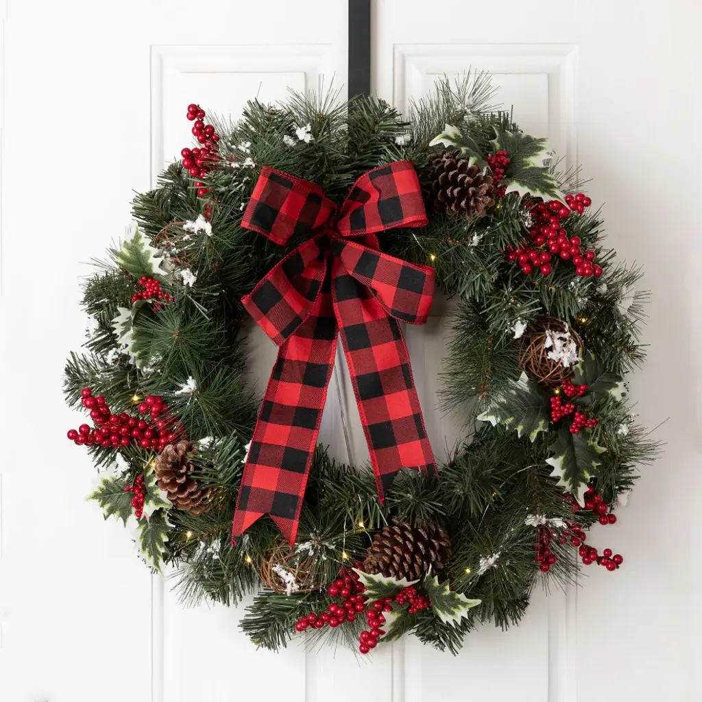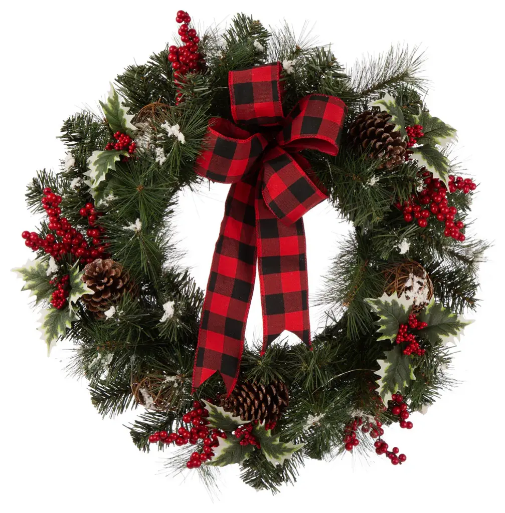 This LED Pre-Lit Greenery Buffalo Bow Berry Holly Pine cone Rattan Ornament Wreath is the perfect touch for your door or wall in the holidays. The wreath includes large pine cones, mixed types of tree needles and red berries all on a natural twig base. Display this completed wreath off of a door or wall for a charming Christmas theme. Material: 50% plastic, 10% Styrofoam, 10% wire, 10% pine cone, 20% twigSize: 24"D; 1.76 lbsFor indoor use or covered porch3 AA Battery required, battery is not included