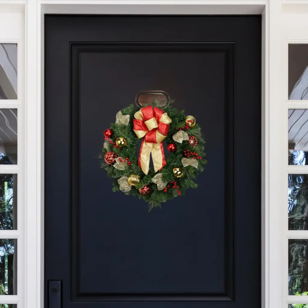 A stunning wreath in shades of burgundy dark red and gold - the Madison 24-inch wreath is perfect for any door or wall. It is accented with weather-safe ribbons and shatterproof ornaments on a PVC mixed greenery base, so it is ideal for outdoor settings as well as over a mantel inside. Pre-lit with 30 soft white battery-operated LED lights with a built-in timer function that runs 6 hours on and 18 hours off.