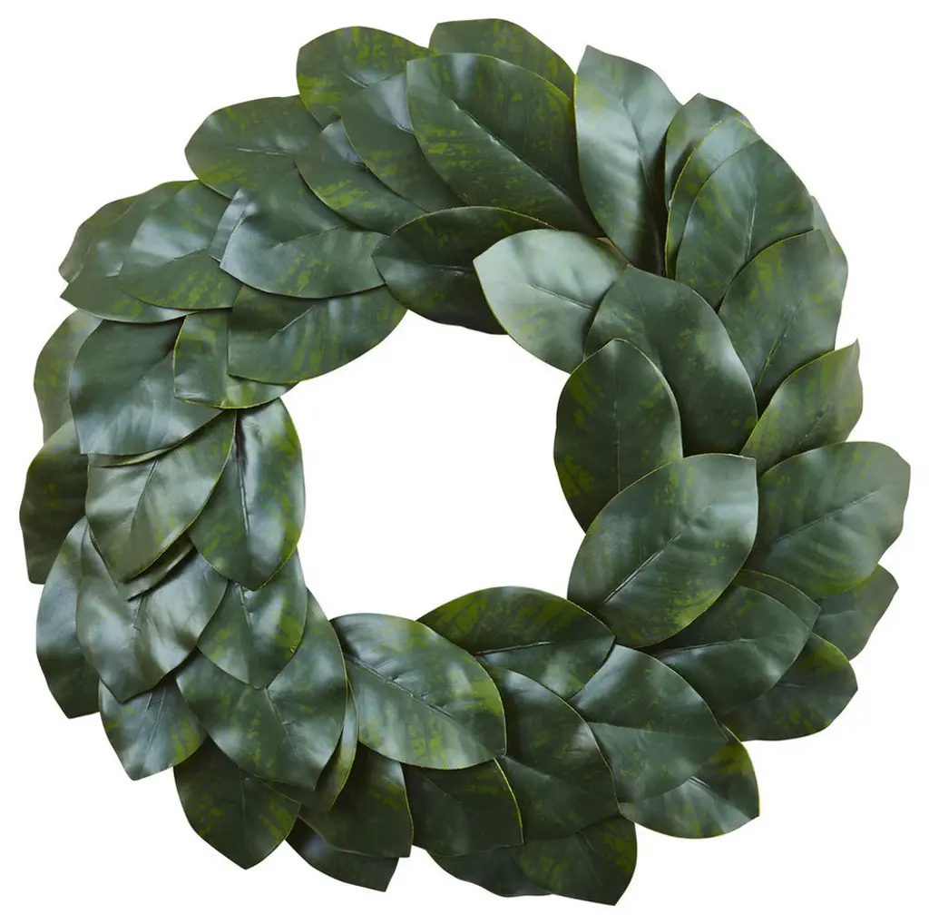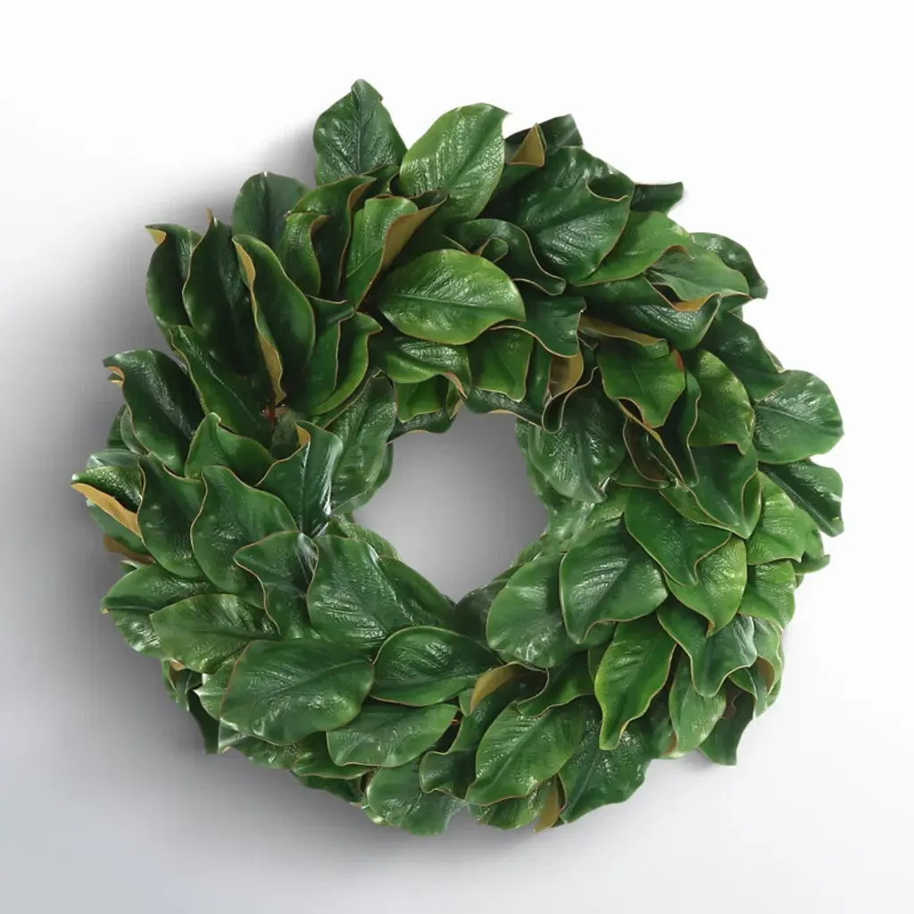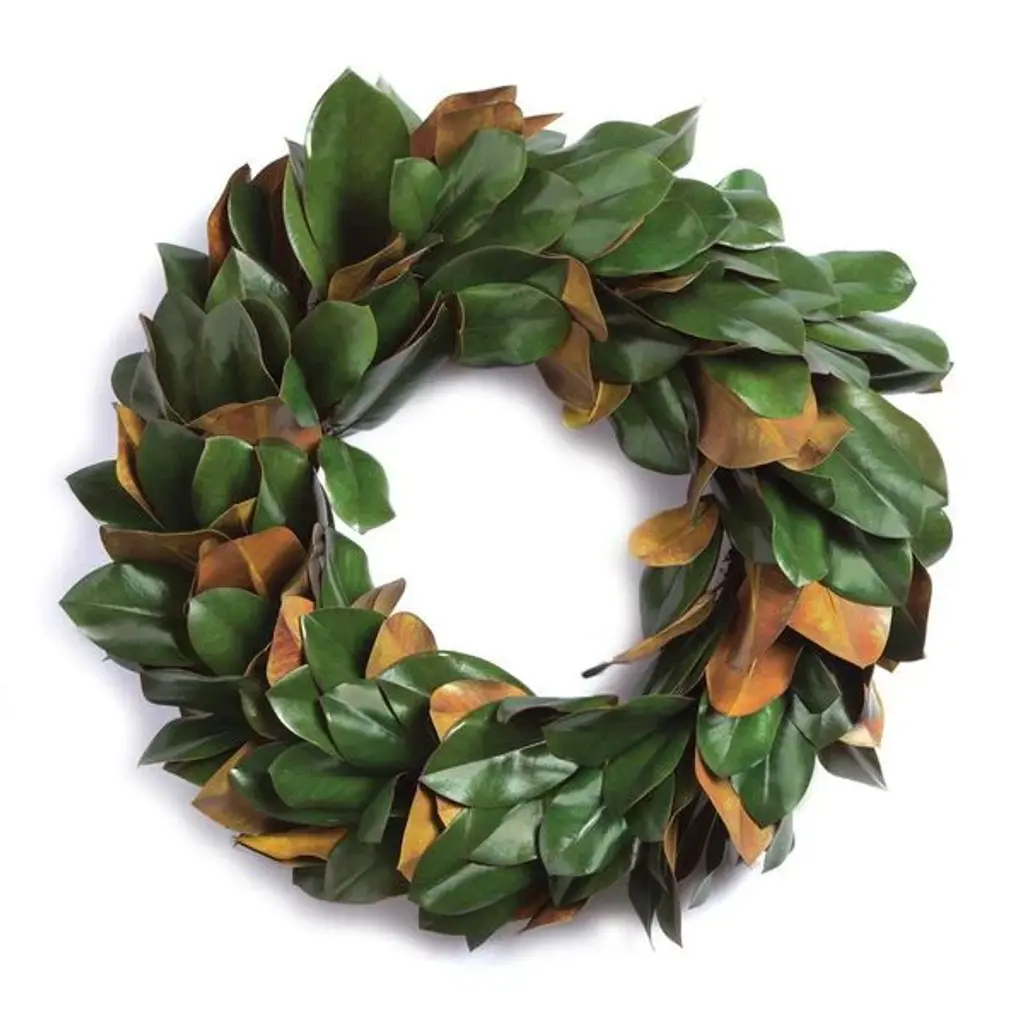 Want to do something a little different Then display this interesting magnolia leaf wreath, and watch people gaze at it and say "wow, that''s really cool". The leaves circle round and round, and are layered almost like armor, giving this wreath a one of a kind look. Best of all, it''ll never dry out, meaning it will be eliciting comments for years to come. Also makes an interesting gift.