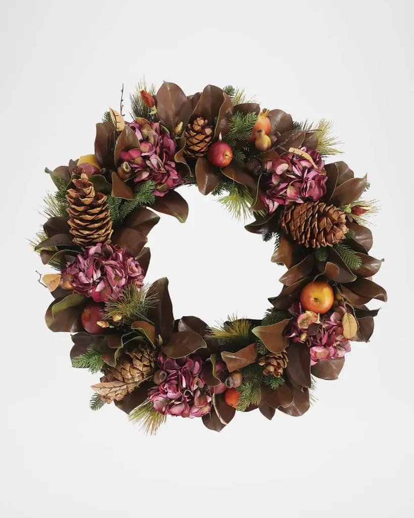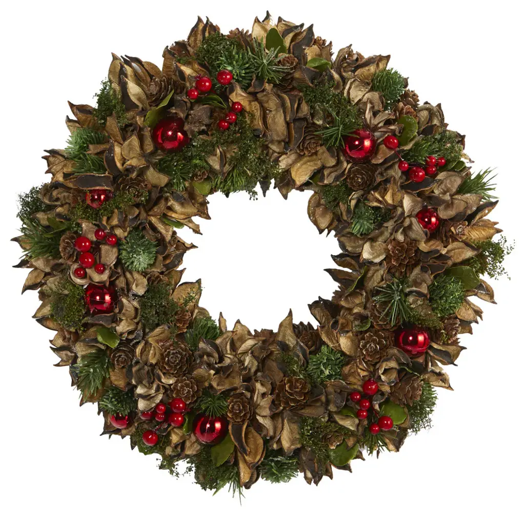 No matter what your decor or mood, this incredible holiday wreath will fit right in. Combining the best of everything, the green leaves and pine fronds provide a backdrop for the delicate magnolias, lush fruit, and beautiful berries of various colors. A gathering of pinecones complete the look, which can only be described as ''absolutely perfect''.