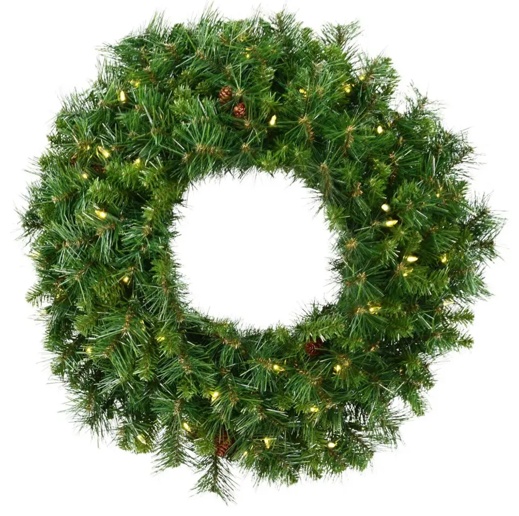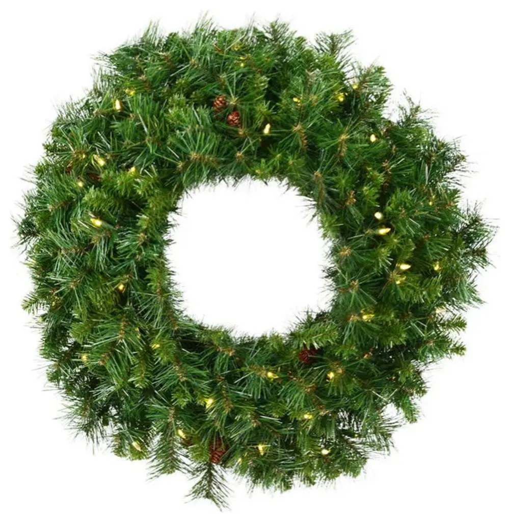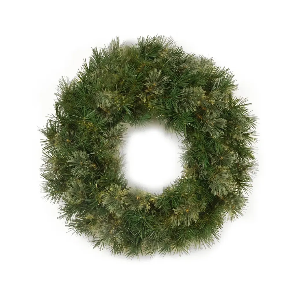 Features a mixture of long and short pine needle tips dipped in gold glitter and accented with gold glitter embellished berriesProduct Features:Unlit80 tips2" wide tapered tipsFor indoor use onlyNo assembly required - wreath comes in 1 pieceIncludes a heavy duty ring metal frame backing for hangingDimensions: 24" diameter (measured from outermost tip/edge to outermost tip/edge across the wreath)Material(s): PVC/metal