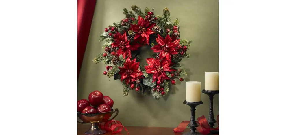 This 24" Poinsettia & Berry Wreath is a preverbal ring of festivity! Holiday colors simply explode from this wreath, filling the eyes with dazzling reds and greens, in all manner of shapes and sizes. Ideal for those times you want to literally "fill" an area with holiday cheer. Also makes a fabulous gift.