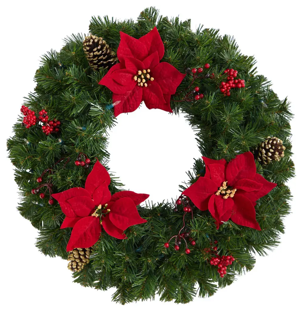 24" Poinsettia, Berry & Pinecone Artificial Wreath With 50 Warm White Led Lights