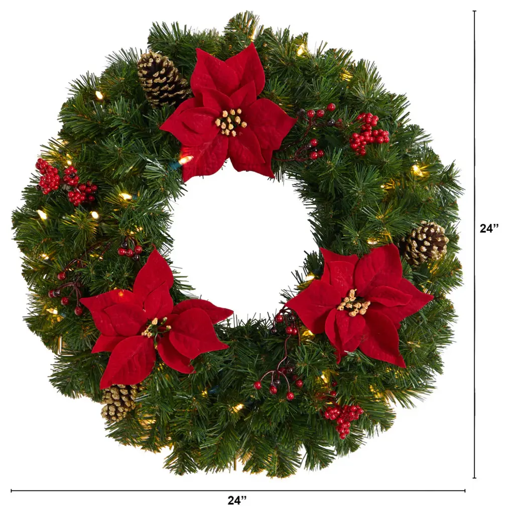 Light up your favorite seasonal accents while adding serious curb-side appeal with this artificial Christmas wreath intricately designed from realistic looking pine foliage in a palette of seasonal evergreens, carefully accented throughout with faux pinecones, berries and Poinsettias that look incredibly realistic. Arriving pre-strung with 50 LED lights to effortlessly illuminate either a wall or door, this 24" (in diameter) decorative wreath makes for an inviting accent and will undoubtedly transform any entrance all throughout the holiday season. 24" Poinsettia, Berry and Pinecone Artificial Wreath with 50 Warm White LED Lights