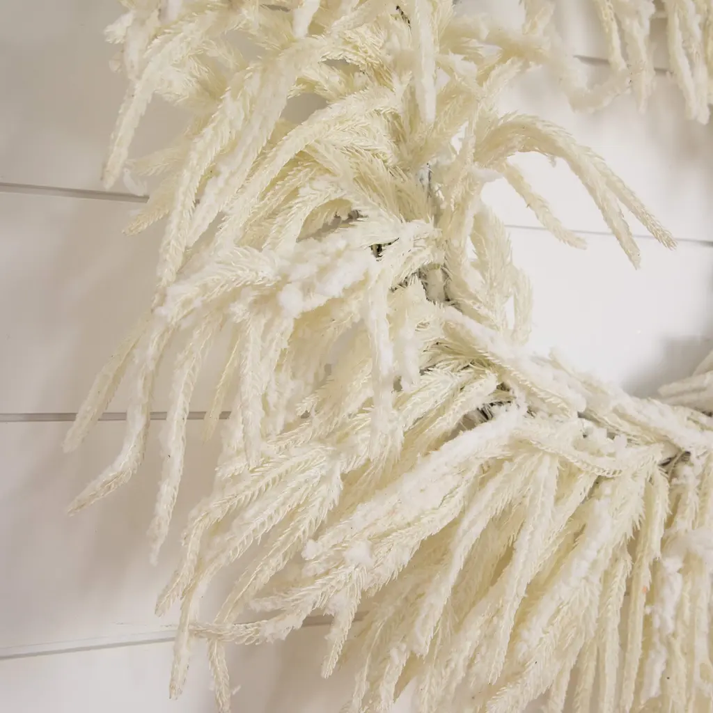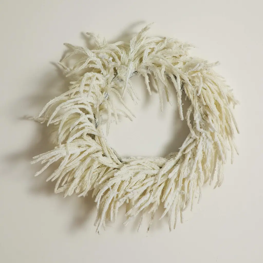 Evoke hints of a winter wonderland on bare surfaces with the help of this artificial white Norfolk Island Pine wreath. An ethereal wreath inspired by snow-dusted landscapes, it has feathery, white foliage for a delicate, frost-like appearance that requires no maintenance. The branches are made of high-quality materials, you'll notice the attention to detail in its natural look and real touch branches that are bendable to fit any space. With a diameter of 24-In, it's a subtle piece for a contemporary holiday spread. Add some pinecones, berries or other accents for a rustic touch of the outdoors.