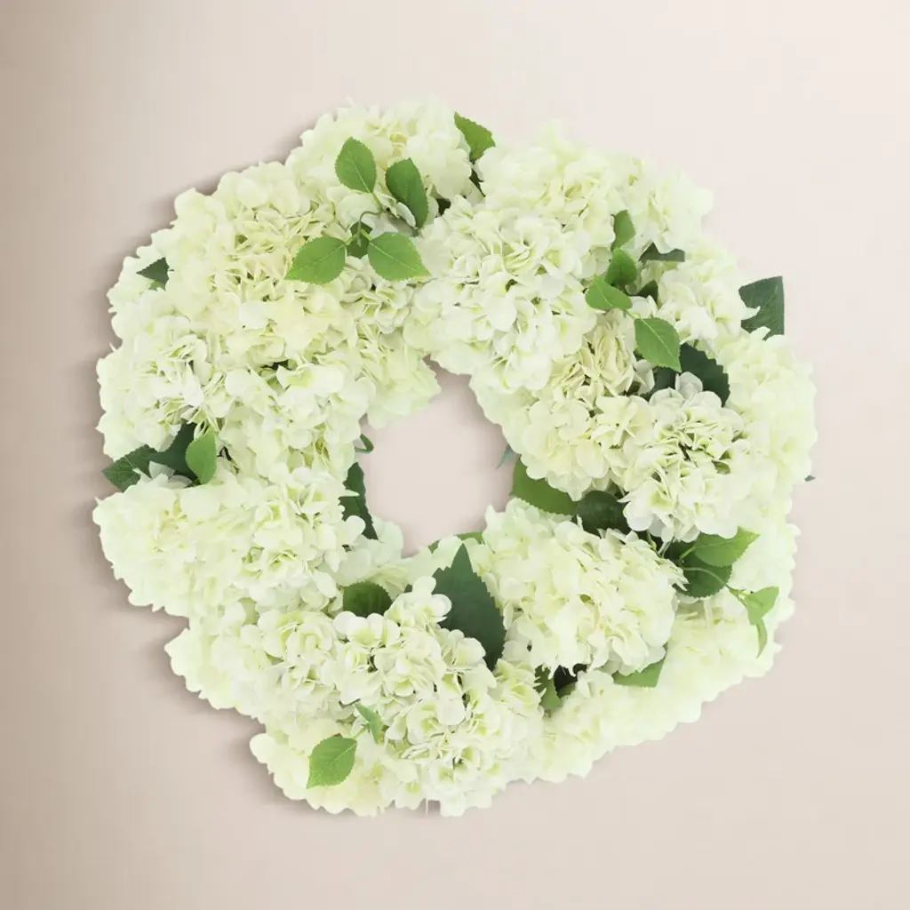 Get ready for spring or summer with this beautiful hydrangea wreath. The wreath features large gorgeous blooms along with assorted green leaves and fern. It is set upon a natural twig base.