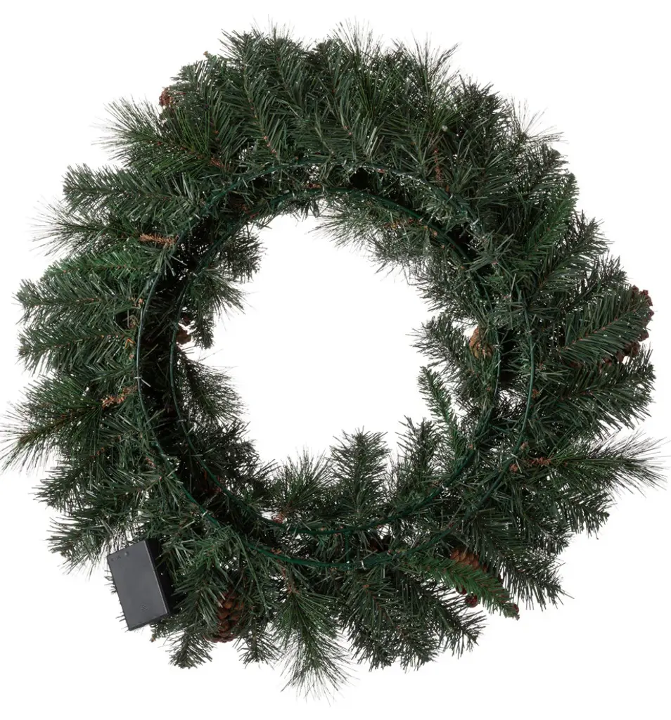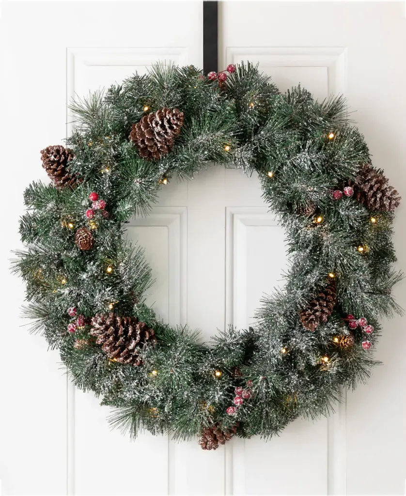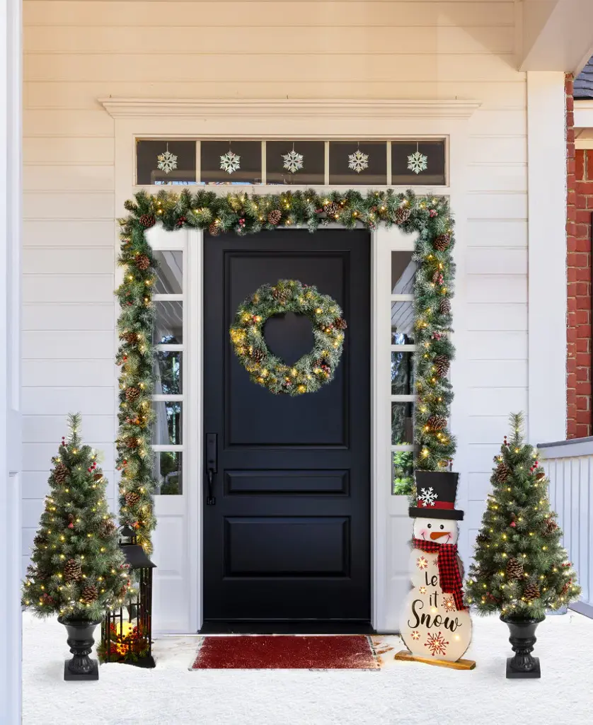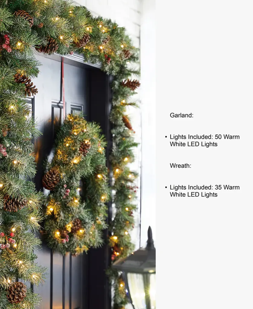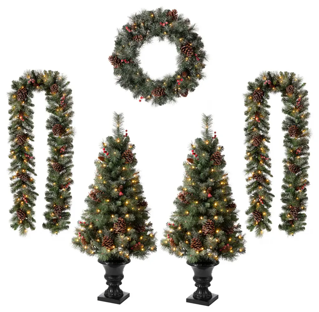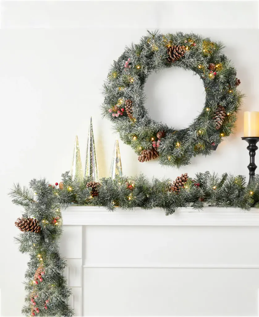 24"d Pre-Lit Christmas Wreath, 2-Pack 9' Garland & 2-Pack Flocked Christmas Tree