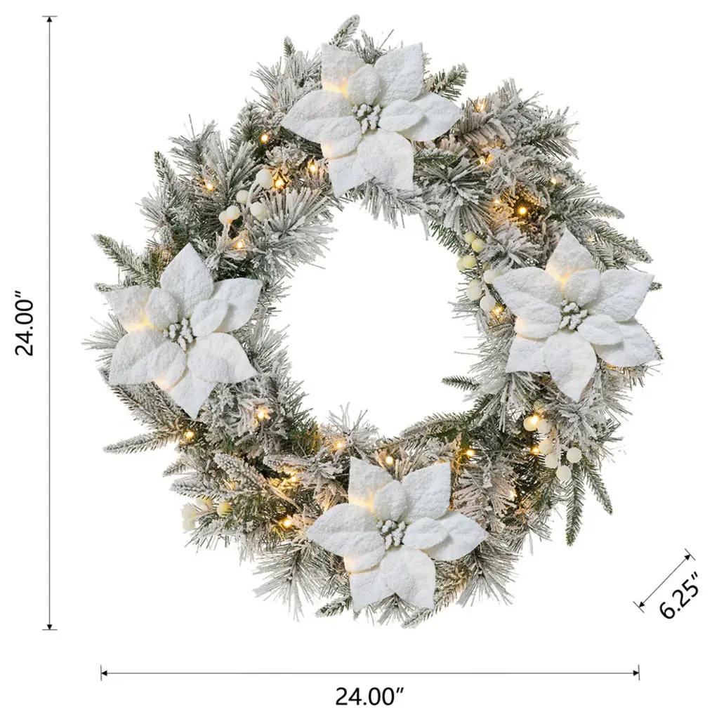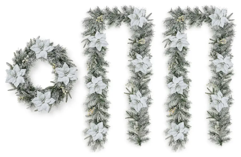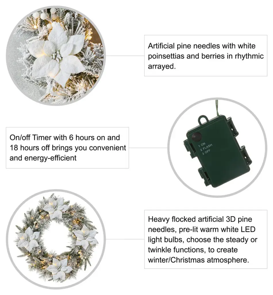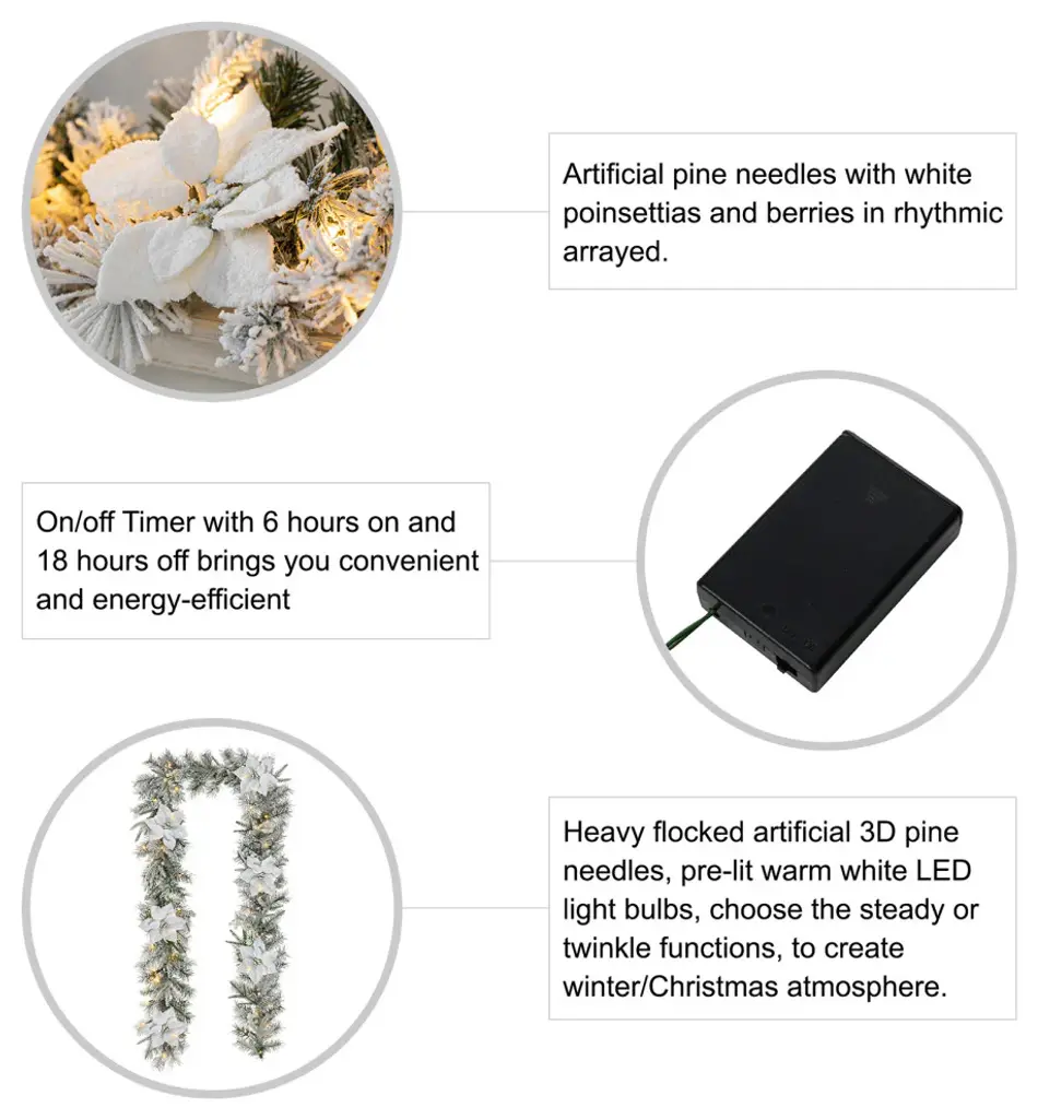 "This set sale Several creating the perfect holiday touch for your home. The snow flocked 24""D Christmas Wreath is crafted with Pine needle tips, Poinsettia and White Berries. it will add a touch of charming light and cheer to your front door or window during your holiday season. The 9ft snow flocked garland provides ample length to easily adorn doors, mantles or banisters, making this versatile decoration ideal for any situation. Each of the 120 tips is modeled to a pine tree"™s while the snow flocked design creates a winter wonderland around your home. White Berries and Poinsettia among the needles add an extra holiday touch to this garland. It creating the perfect holiday touch for your home. Product may ship compressed -You can adjust all the branches with an elegant look like the images.Set of 31. Heavy flocked artificial 3D pine needles, Pre-lit warm white LED light bulbs, choose the steady or twinkle functions, to create fragrant Christmas atmosphere2. Garland Branch Tip Count : 120, White Poinsettia: 6, White Berries: 6 Cluster, 12pcs/Cluster, 50 Warm White LED Lights, 3AA Battery Operated, Battery is not included3. Wreath Branch Tip Count : 90, Poinsettia: 4, White berries: 4 Cluster, 12pcs/Cluster, 50 Warm White LED Lights, 3AA Battery Operated, Battery is not included4. Artificial pine needles with white poinsettias and berries in rhythmic arrayed5. Fluff and shape greenery after unpacking6. Wipe clean with a soft, dry cloth or duster7. On/off Timer with 6 hours on and 18 hours off brings you convenient and energy-efficient"