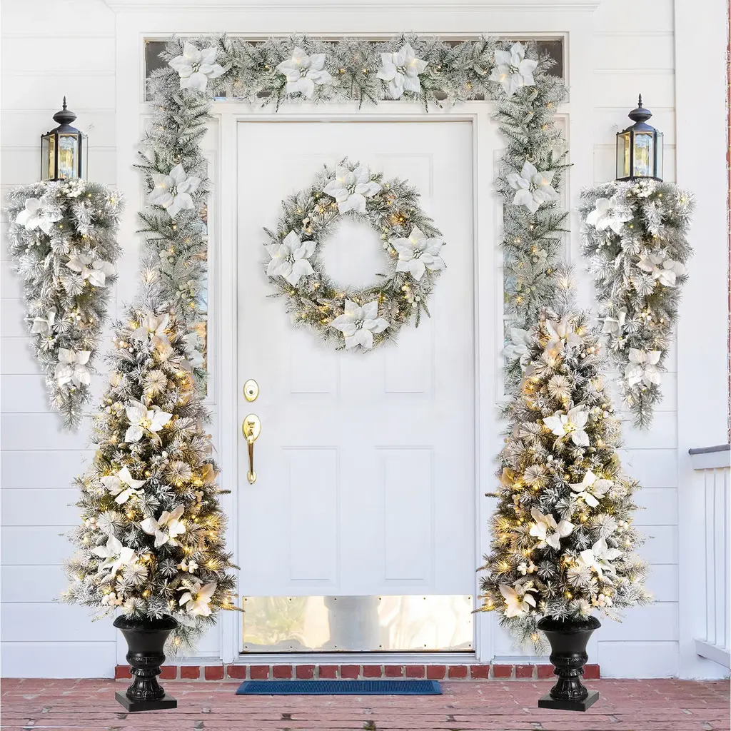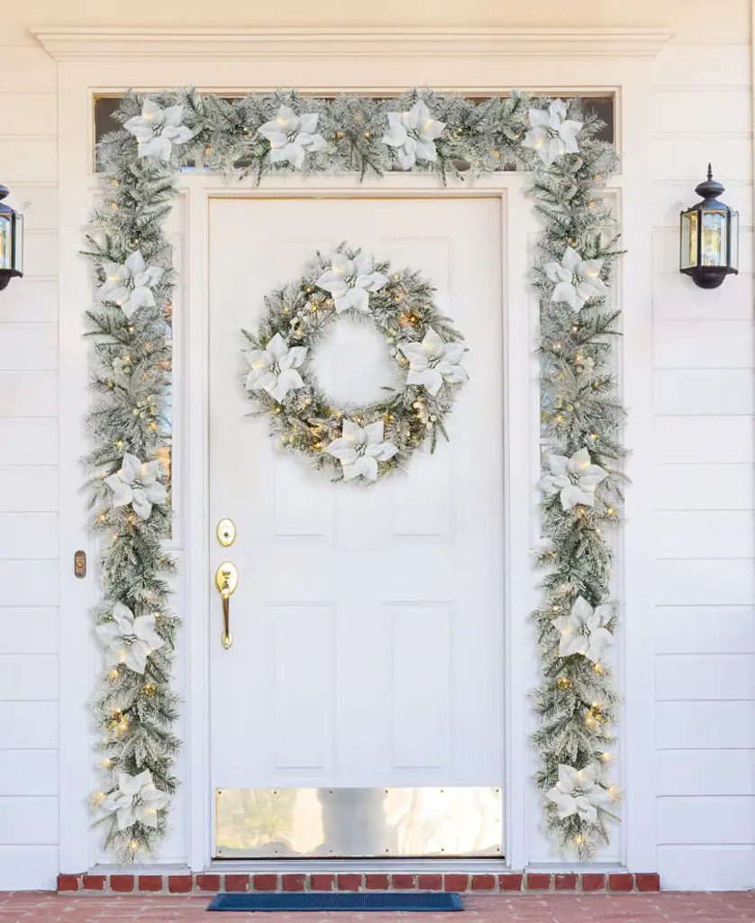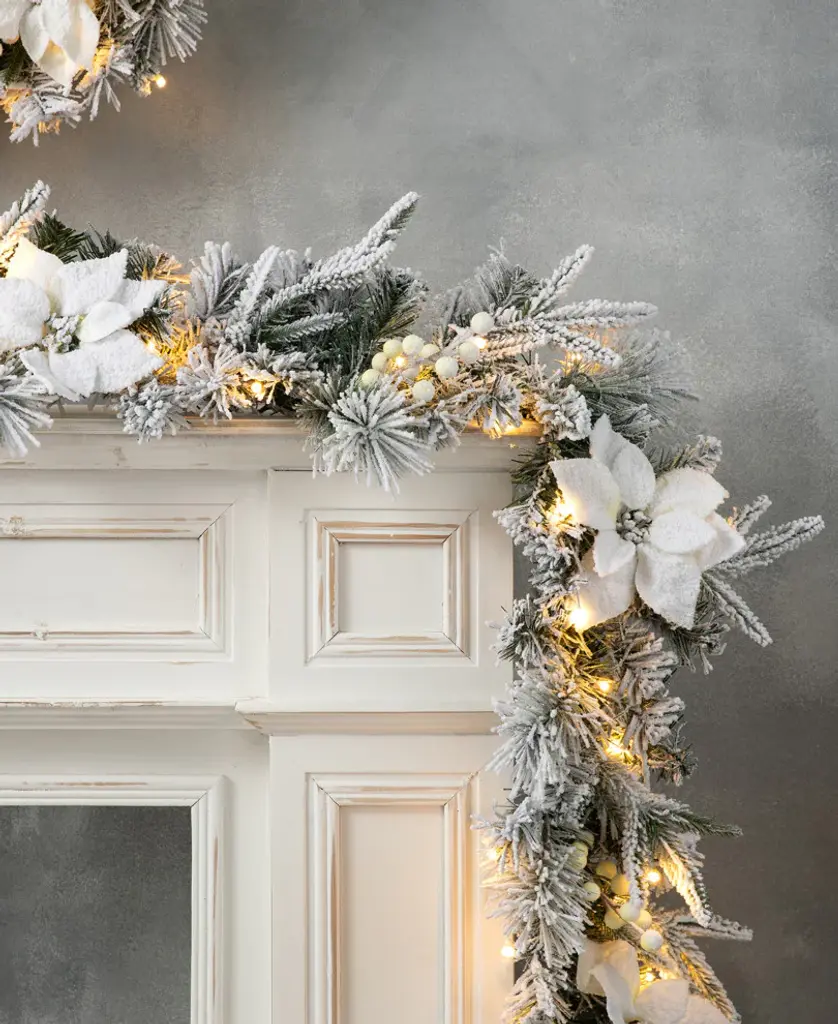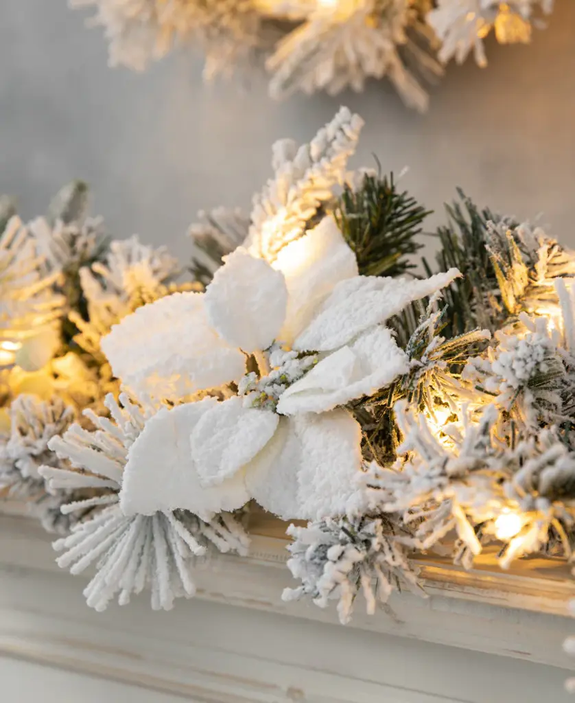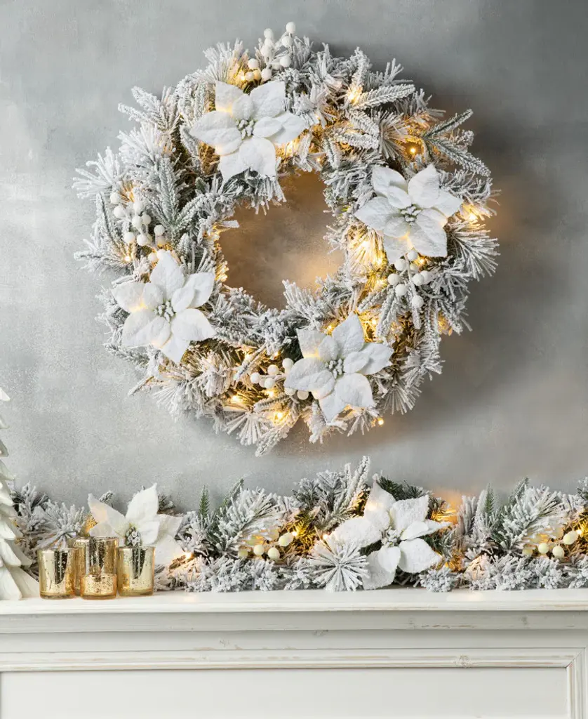 "This set sale Several creating the perfect holiday touch for your home. The snow flocked 24""D Christmas Wreath is crafted with Pine needle tips, Poinsettia and White Berries. it will add a touch of charming light and cheer to your front door or window during your holiday season. The 9ft snow flocked garland provides ample length to easily adorn doors, mantles or banisters, making this versatile decoration ideal for any situation. Each of the 120 tips is modeled to a pine tree"™s while the snow flocked design creates a winter wonderland around your home. White Berries and Poinsettia among the needles add an extra holiday touch to this garland. It creating the perfect holiday touch for your home. Product may ship compressed -You can adjust all the branches with an elegant look like the images.Set of 31. Heavy flocked artificial 3D pine needles, Pre-lit warm white LED light bulbs, choose the steady or twinkle functions, to create fragrant Christmas atmosphere2. Garland Branch Tip Count : 120, White Poinsettia: 6, White Berries: 6 Cluster, 12pcs/Cluster, 50 Warm White LED Lights, 3AA Battery Operated, Battery is not included3. Wreath Branch Tip Count : 90, Poinsettia: 4, White berries: 4 Cluster, 12pcs/Cluster, 50 Warm White LED Lights, 3AA Battery Operated, Battery is not included4. Artificial pine needles with white poinsettias and berries in rhythmic arrayed5. Fluff and shape greenery after unpacking6. Wipe clean with a soft, dry cloth or duster7. On/off Timer with 6 hours on and 18 hours off brings you convenient and energy-efficient"