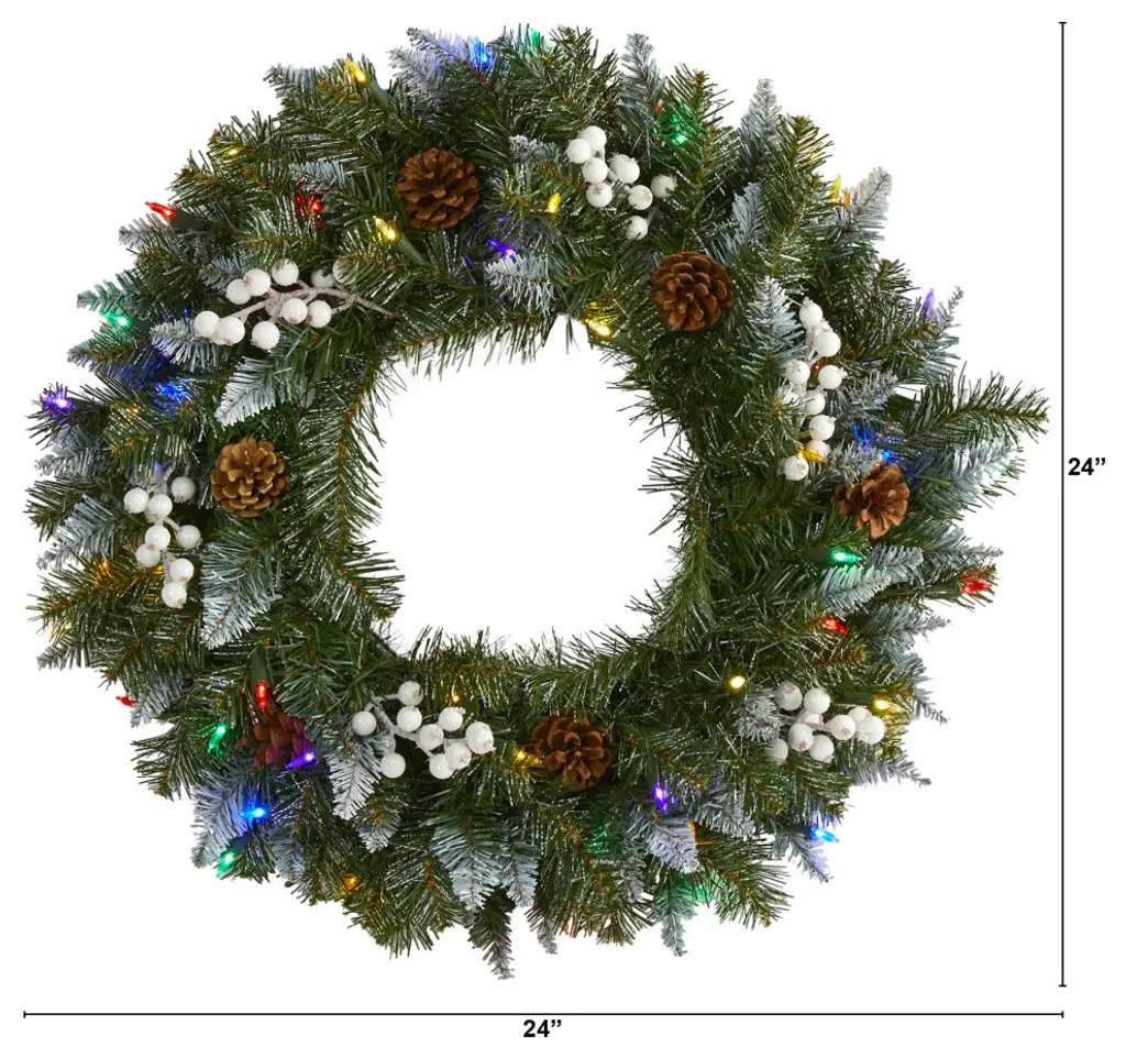 Light up your favorite seasonal accents while adding serious curb-side appeal with this artificial Christmas wreath intricately designed from realistic looking foliage in a palette of seasonal evergreens and accented throughout with faux pinecones that look incredibly realistic - all finished with a light dusting of fake snow. Arriving pre-strung with 50 multi-colored LED lights to effortlessly illuminate either a wall or door, this 24� (in circumference) decorative wreath makes for an inviting accent and will undoubtedly transform any entrance all throughout the holiday season.