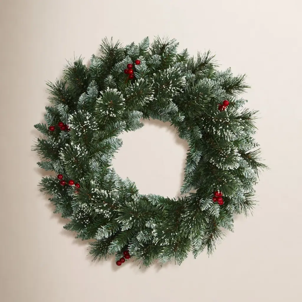 Light up your favorite seasonal accents while adding serious curb-side appeal with this artificial wreath intricately designed from realistic looking mountain pine foliage in a palette of seasonal evergreens, carefully accented throughout with faux pinecones that look incredibly lifelike. Arriving pre-strung with 35 clear LED lights to effortlessly illuminate either a wall or door, this 24� (in circumference) decorative wreath makes for an inviting accent and will undoubtedly transform any entrance all throughout the holiday season.