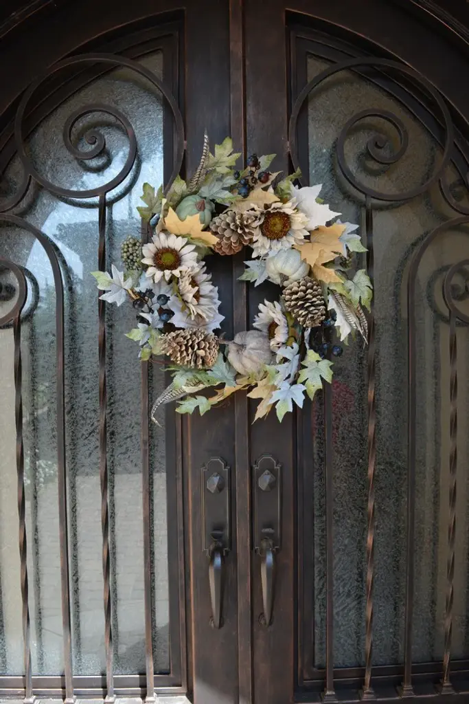 The 24" artificial maple pine cone wreath features several leaves in different shades of green, orange, and red. With small pine cones spread throughout the piece, this wreath truly encompasses the spirit of the autumn season. It's perfect for a hallway, door, or office space.