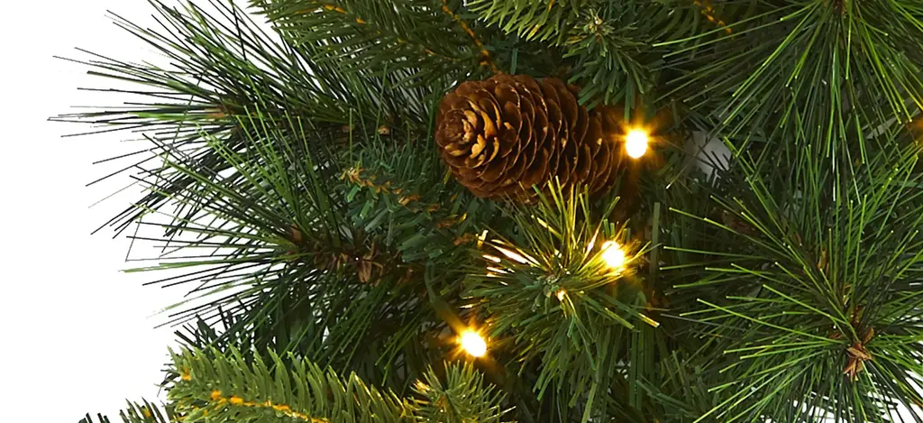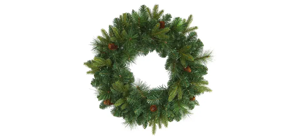Light up your favorite seasonal accents while adding serious curb-side appeal with this artificial wreath intricately designed from a mix of realistic looking mountain pine foliage in a palette of seasonal evergreens, carefully accented throughout with faux pinecones that look incredibly lifelike. Arriving pre-strung with 35 clear LED lights to effortlessly illuminate either a wall or door, this 24" (in circumference) decorative wreath makes for an inviting accent and will undoubtedly transform any entrance all throughout the holiday season.