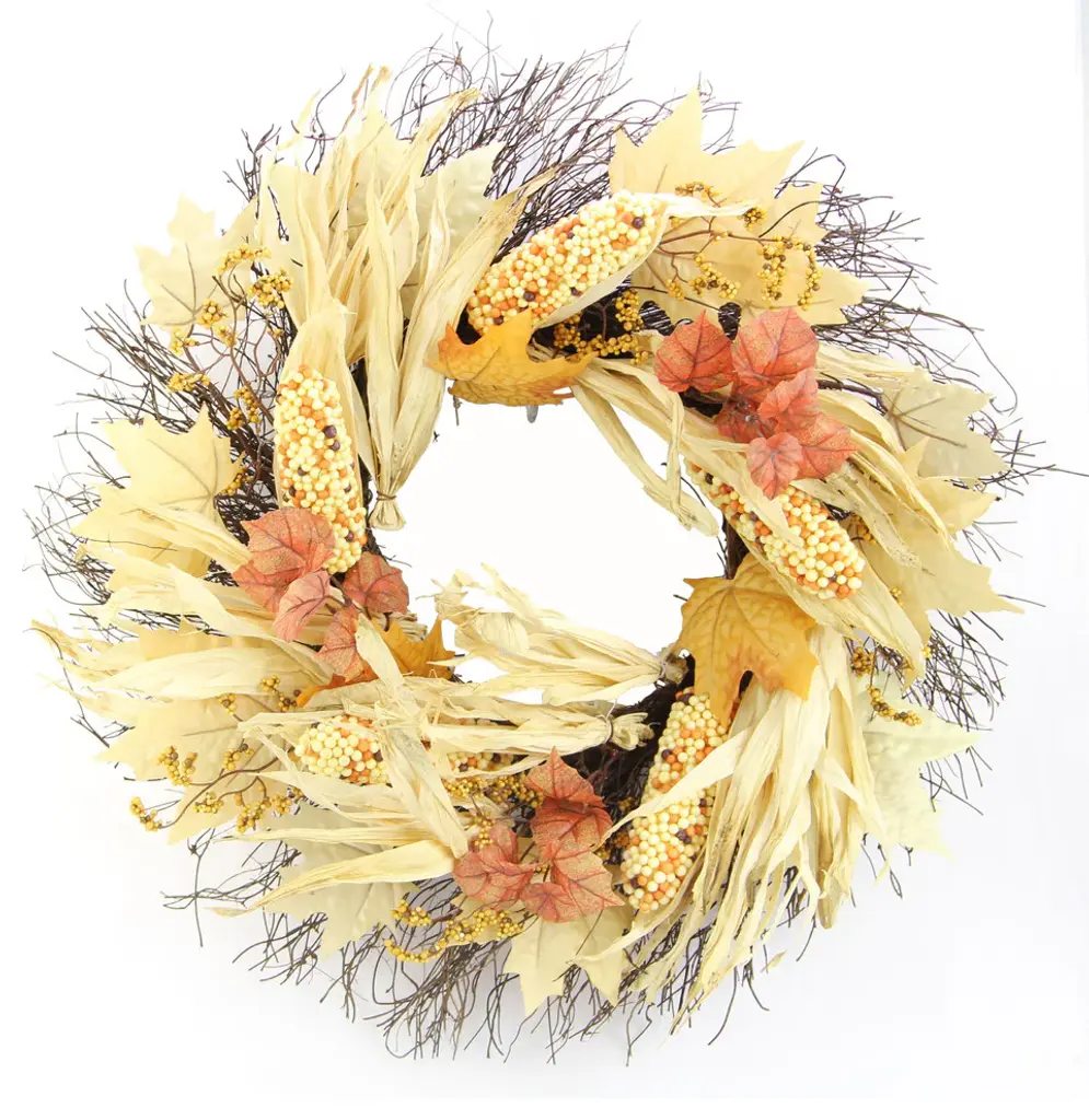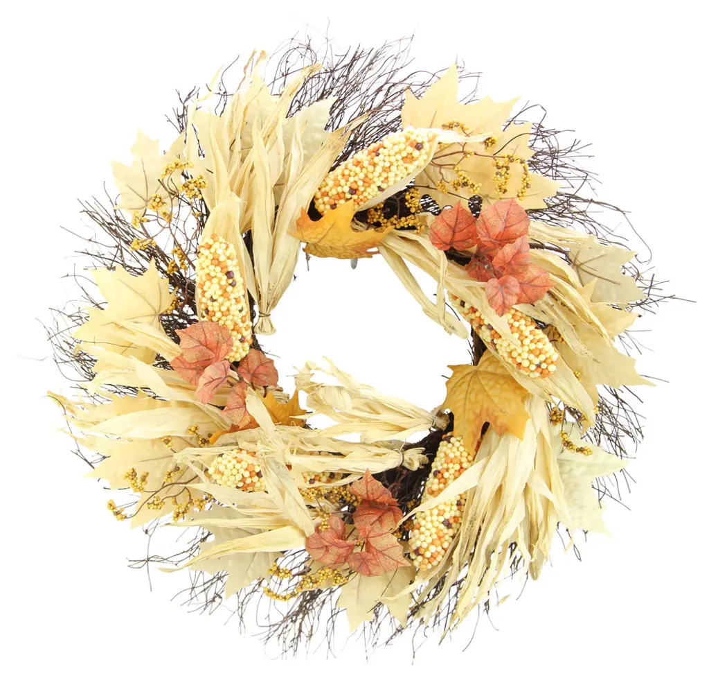 24 inches Artificial Indian corn husks wreath for Autumn Fall and Thanksgiving decoration. It has a beautiful design with corn, corn husks and fall leaves. It has a natural looks and feel, you will not believe its faux. It is prefect for doors, windows, walls, mantles for office, restaurant and retail stores decoration or as a gift. Dimensions based on image shown. Primping required to match on the image shown.