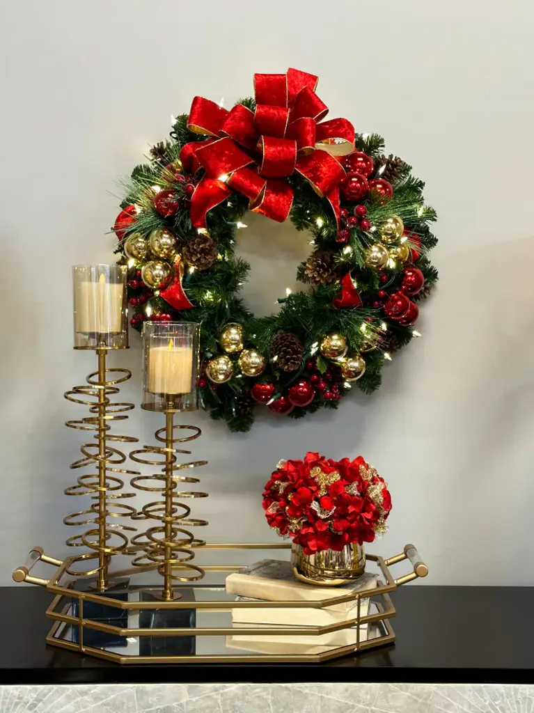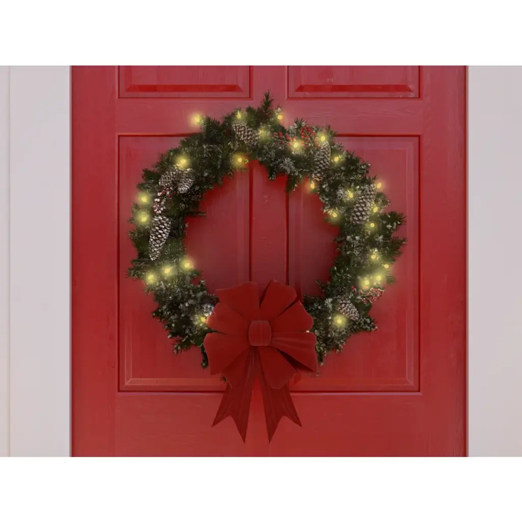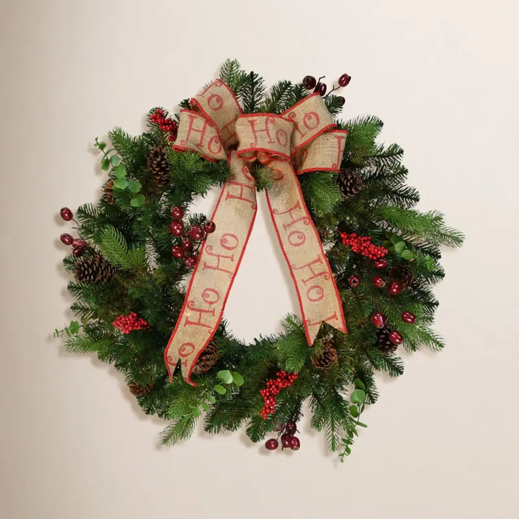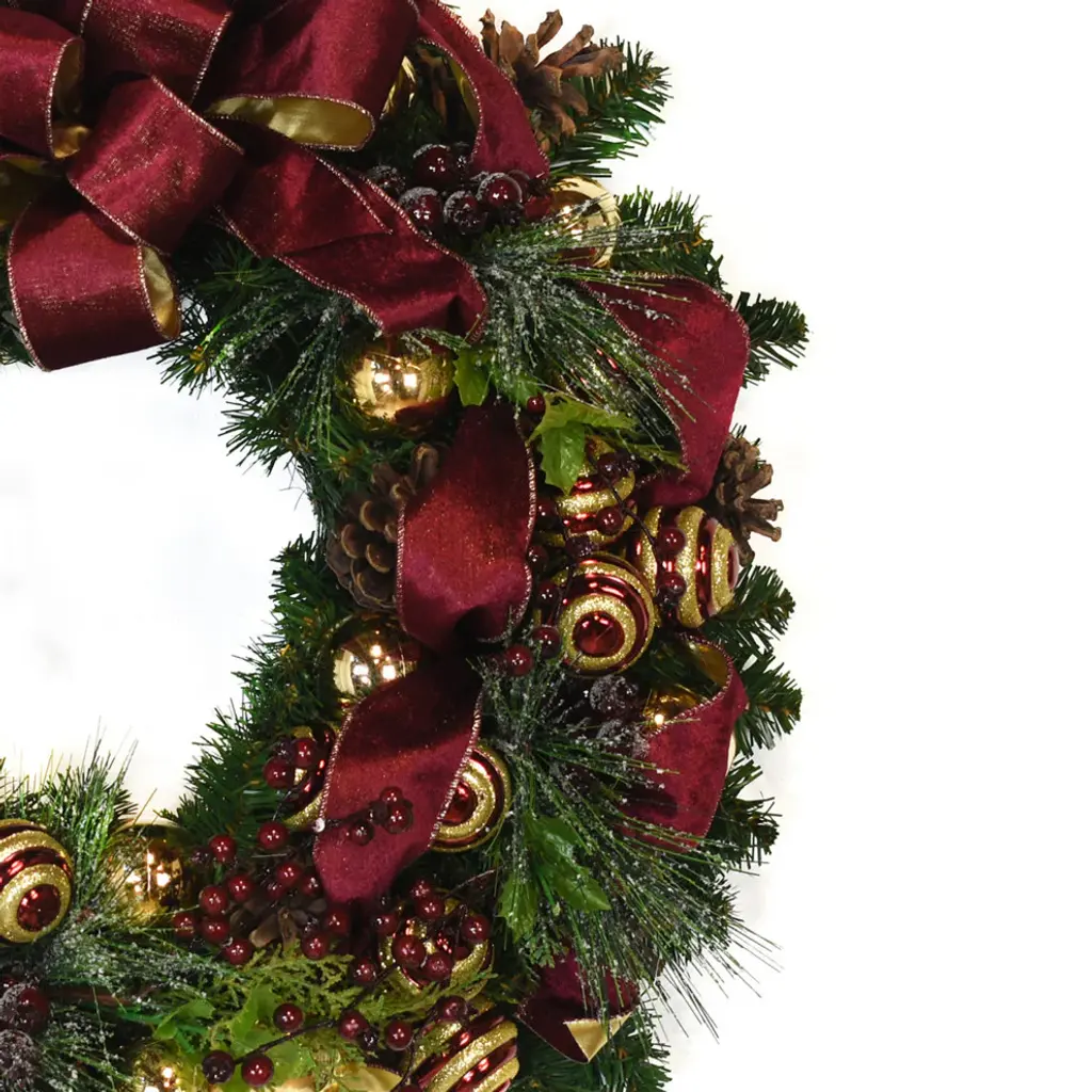 Welcome the holidays into your home with the festive, glamorous look of this handcrafted artificial wreath. Adorned with a mix of burgundy/gold swirled and gold ornaments, natural pinecones, burgundy berries, and is embellished with a beautiful large burgundy bow. It offers the look of an evergreen wreath without any of the upkeep. That means you don''t have to worry about cleaning up those pesky pine needles and you can use it year after year. Our wreath can be used indoors or outdoors on a protected covered porch. Handcrafted in the United States.