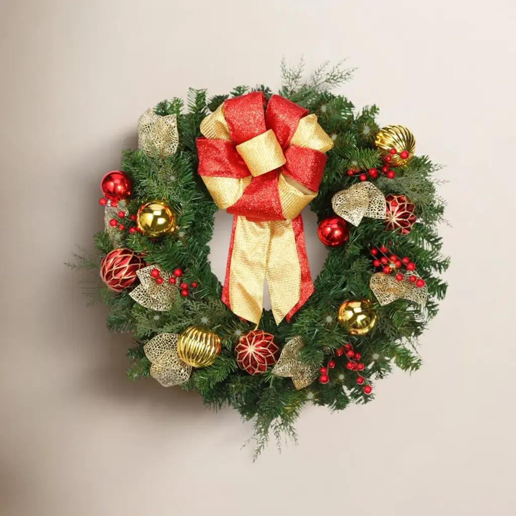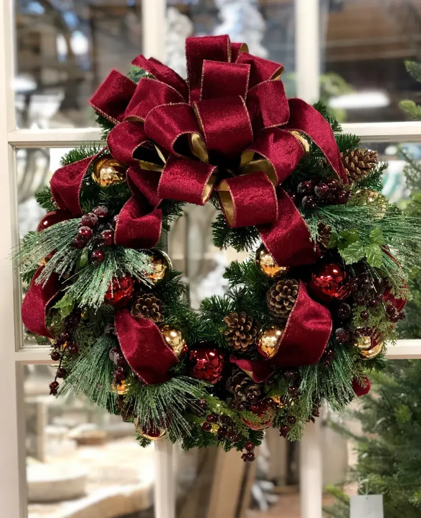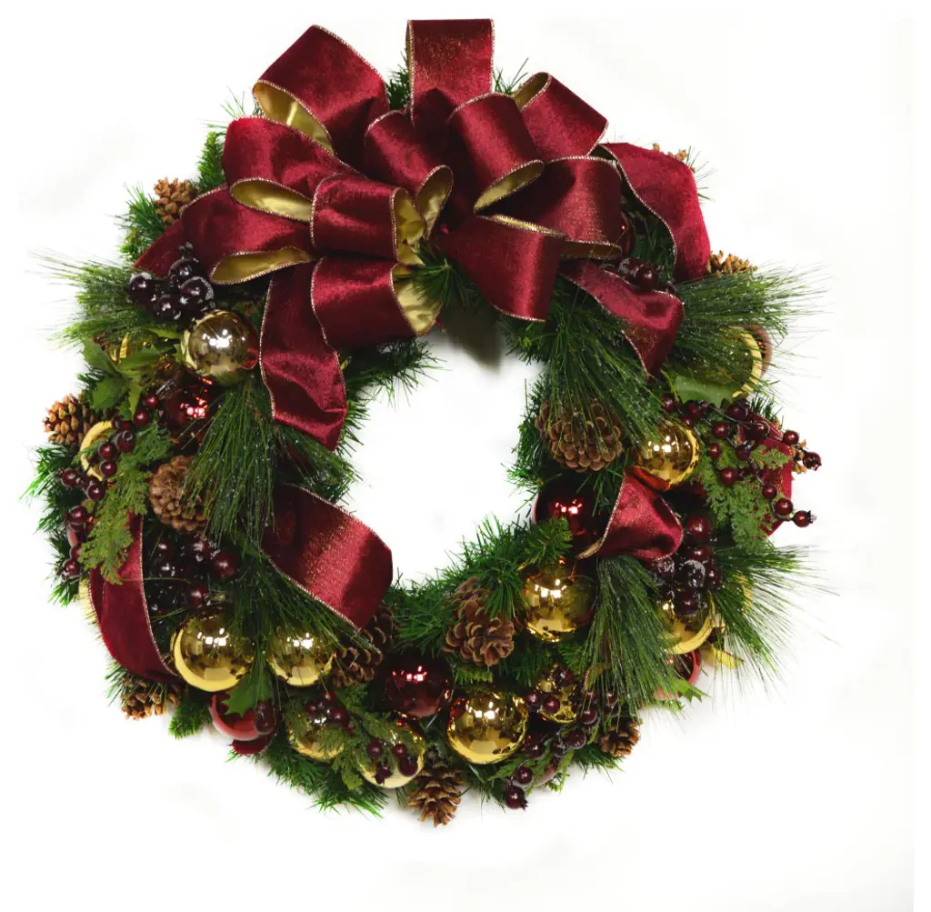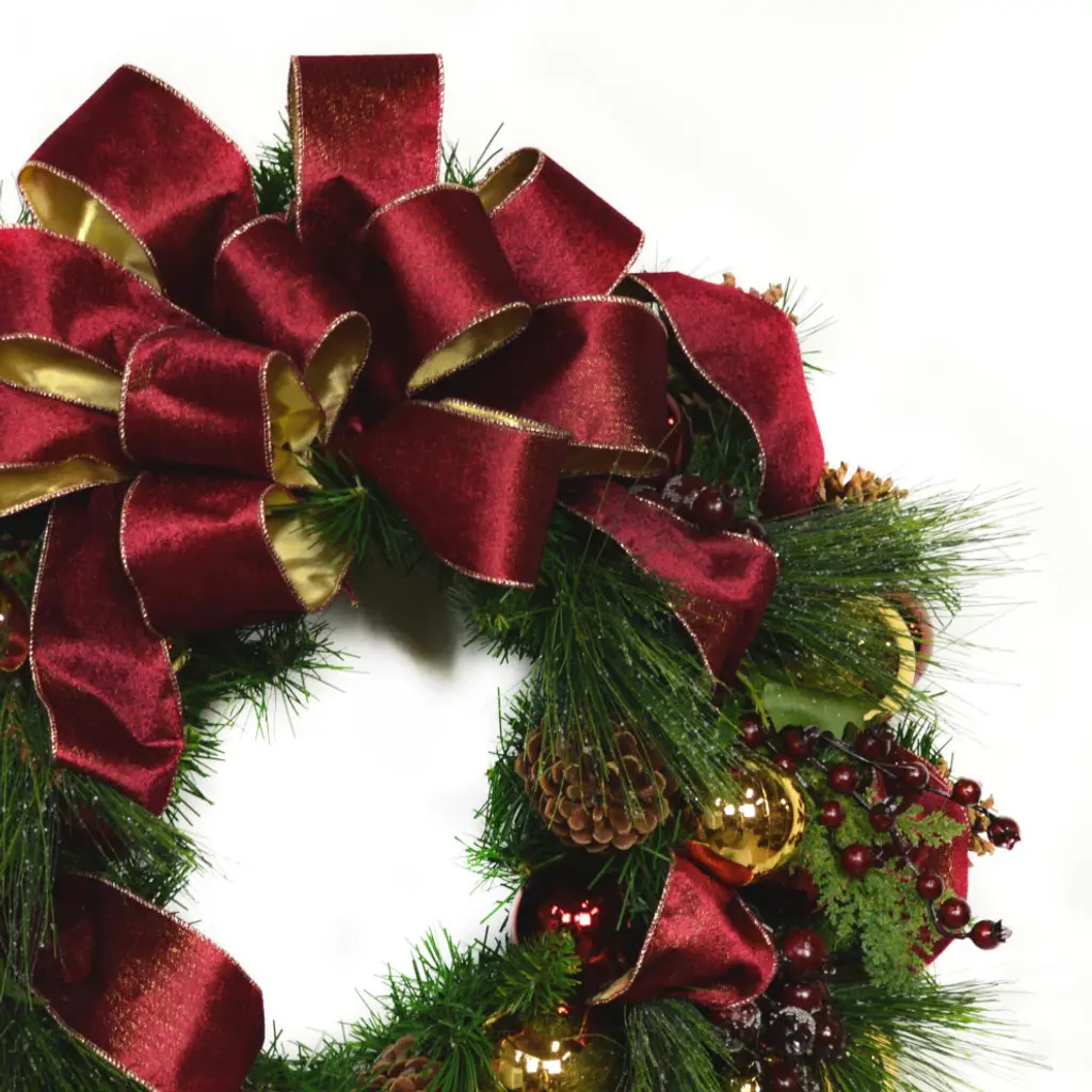 Welcome the holidays into your home with the festive, glamorous look of this handcrafted artificial wreath. Adorned with a mix of gold and burgundy ornaments, berries, pinecones, and a gorgeous burgundy bow, it offers the look of an evergreen wreath without any of the upkeep. That means you don''t have to worry about cleaning up those pesky pine needles and you can use it year after year. Our wreath can be used indoors or outdoors on a protected covered porch. Handcrafted in the United States.