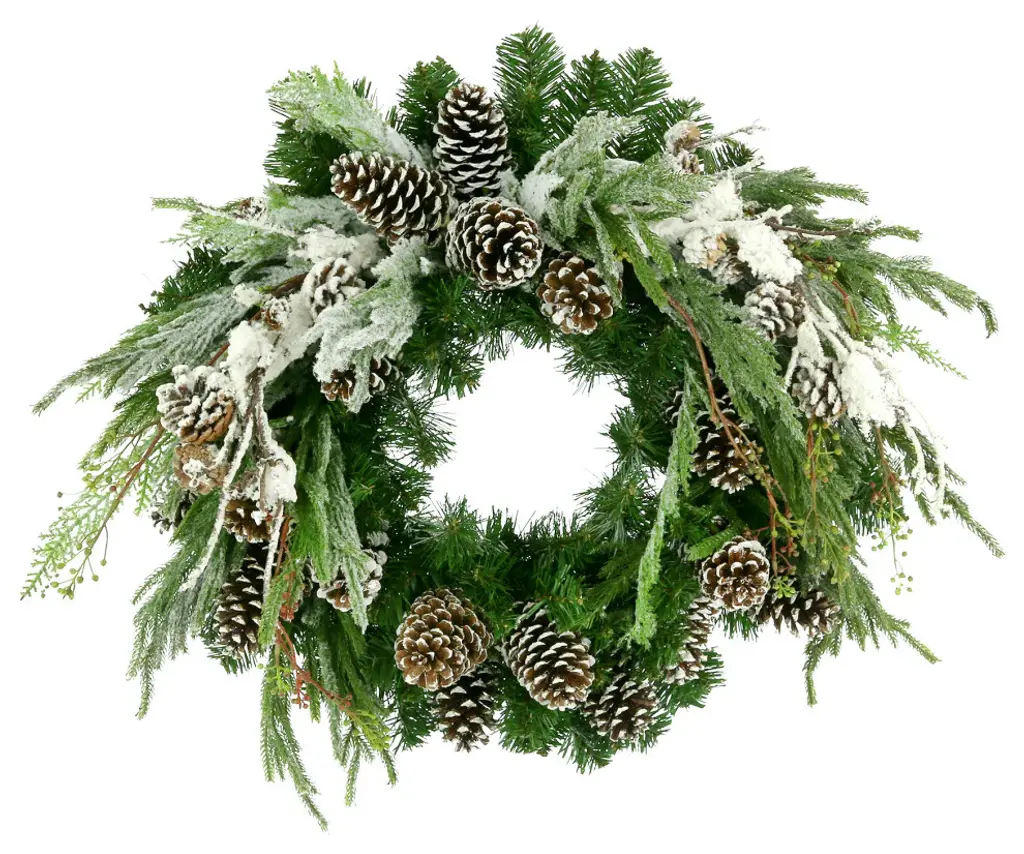 Give your home a festive feel with the glamorous look of this handcrafted artificial wreath. An evergreen wreath is decorated with snow flocked greens, berry branches, and white-tipped pinecones. It offers the look of an evergreen wreath without any of the upkeep. That means you don''t have to worry about cleaning up those pesky pine needles and you can use it year after year. Arriving ready to be displayed, our wreath can be used indoors or outdoors on a protected covered porch. Handcrafted in the United States.