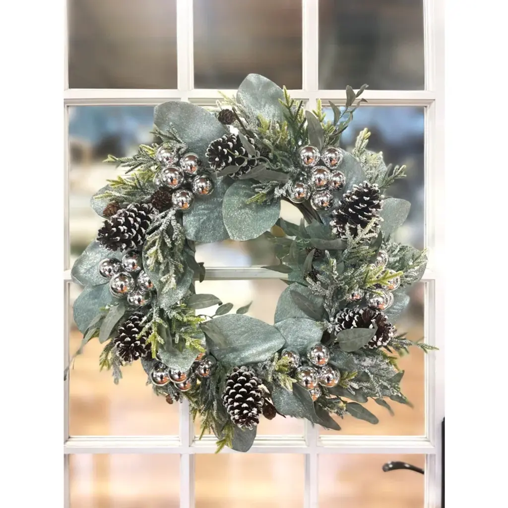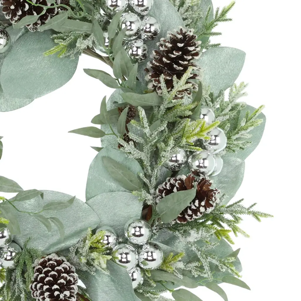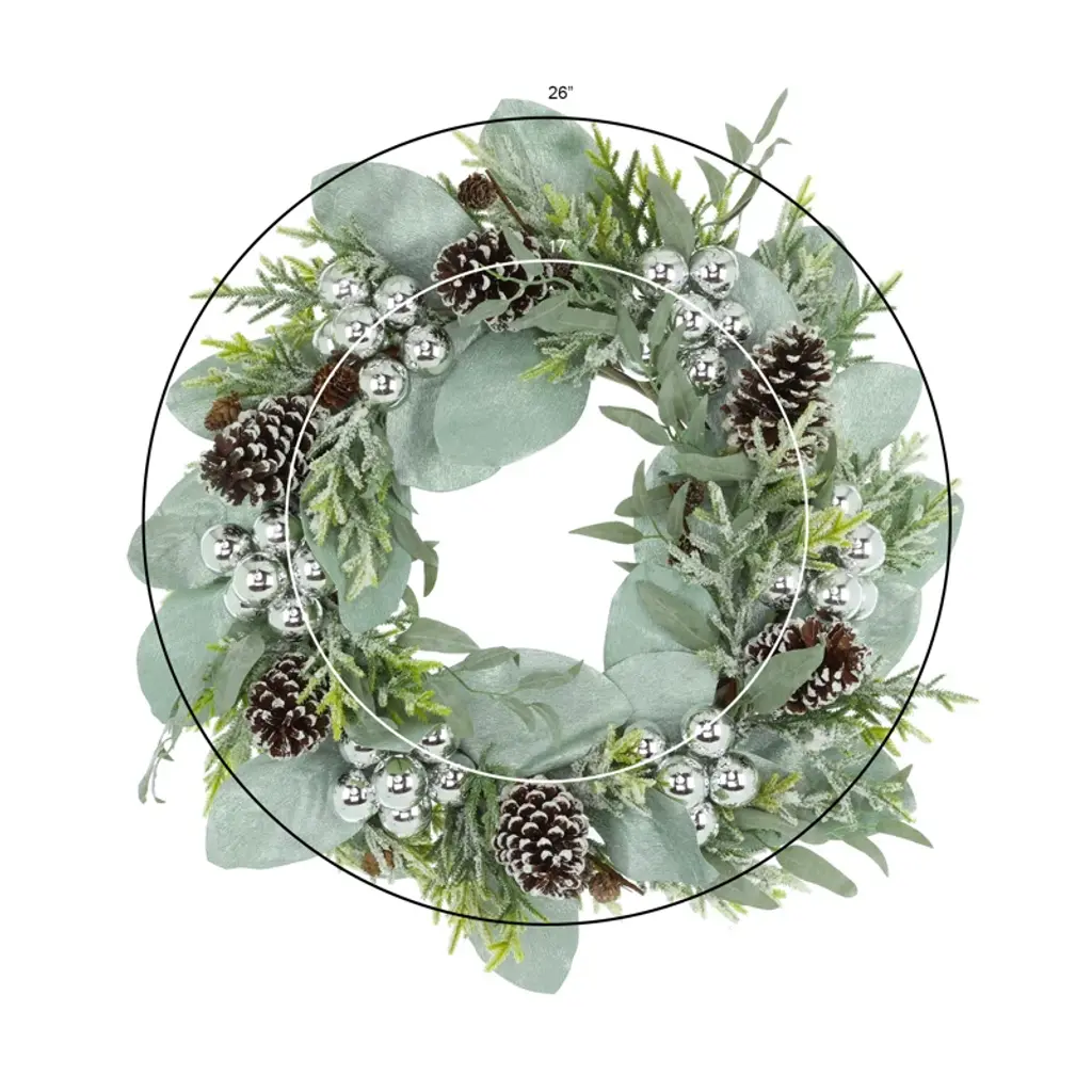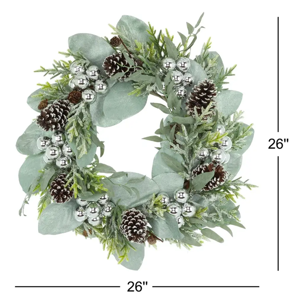 26'' Holiday Wreath Arranged With Flocked Spruce, Pinecones And Ornaments