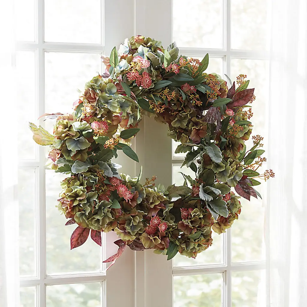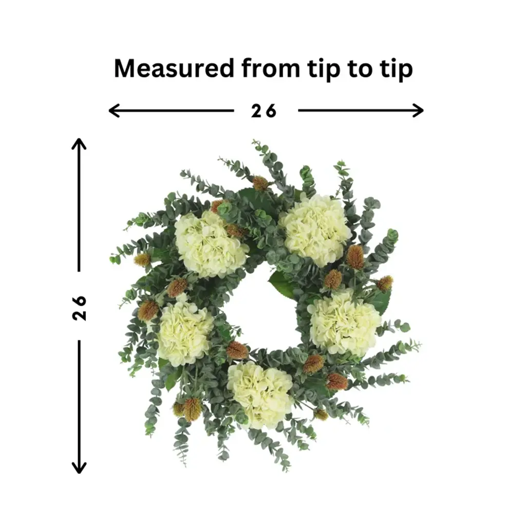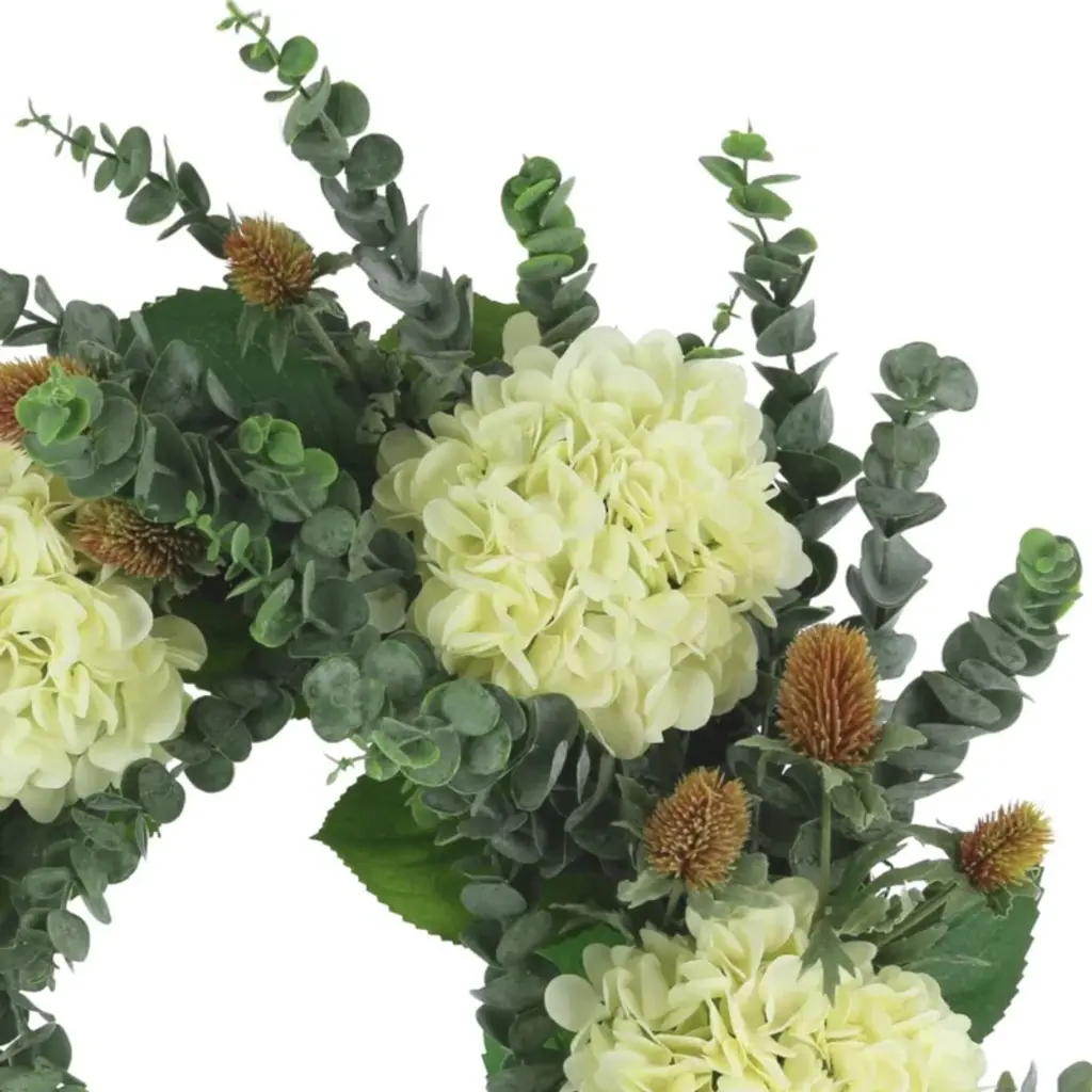 Welcome your guests with a touch of natural elegance with this handcrafted wreath featuring eucalyptus, thistle, and hydrangea. Designed for both indoor and covered outdoor use, this wreath showcases a lush circle of greenery and blooms, making it a versatile addition to your home decor. Made from polyvinyl chloride (PVC), it's easy to maintain – just give it a gentle wipe with a dry cloth. No power source required, simply hang it on your door or wall to create a warm, inviting atmosphere.