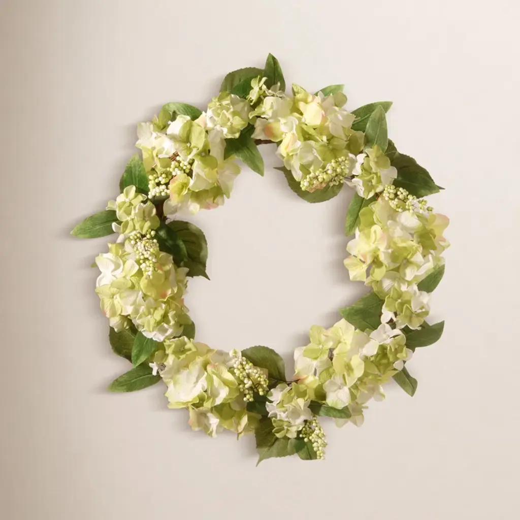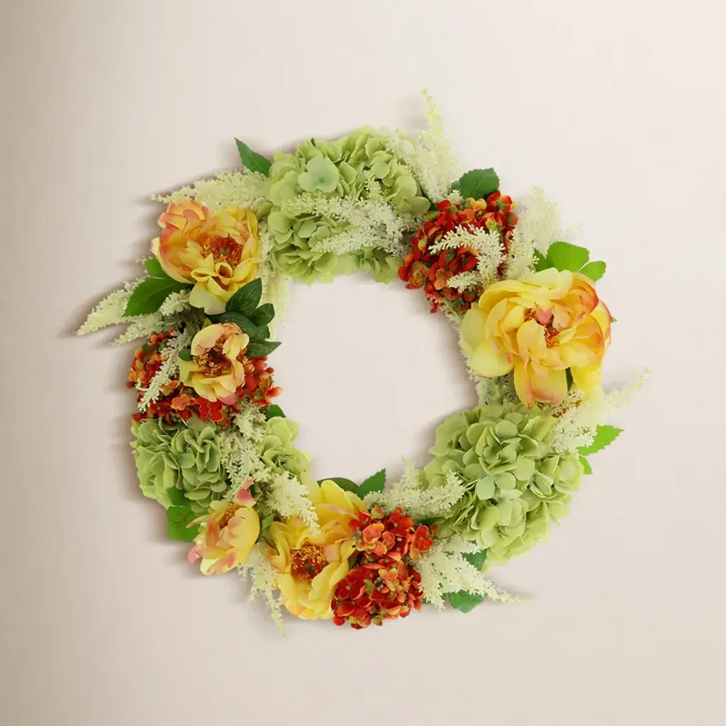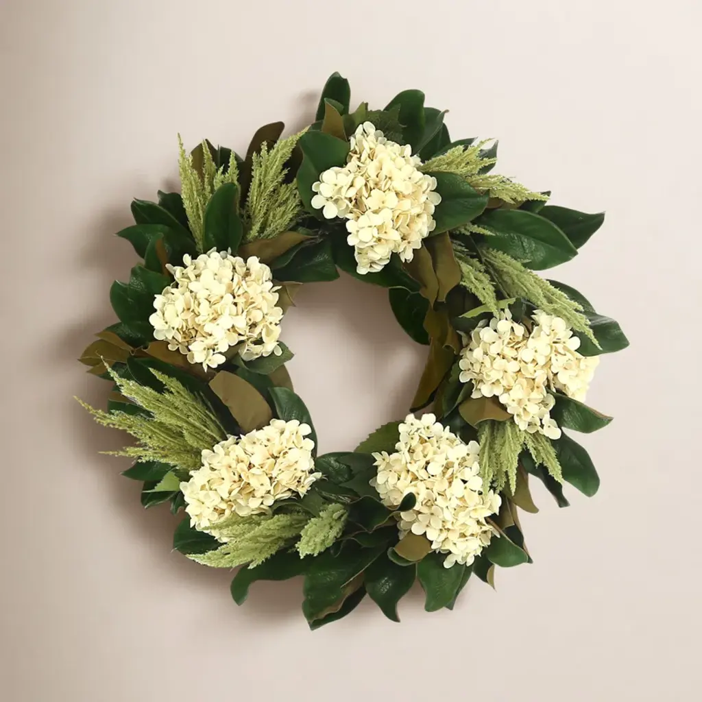 Welcome your guests with a touch of natural elegance with this handcrafted wreath featuring eucalyptus, thistle, and hydrangea. Designed for both indoor and covered outdoor use, this wreath showcases a lush circle of greenery and blooms, making it a versatile addition to your home decor. Made from polyvinyl chloride (PVC), it's easy to maintain – just give it a gentle wipe with a dry cloth. No power source required, simply hang it on your door or wall to create a warm, inviting atmosphere.