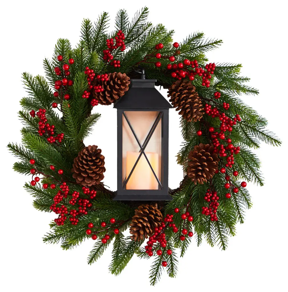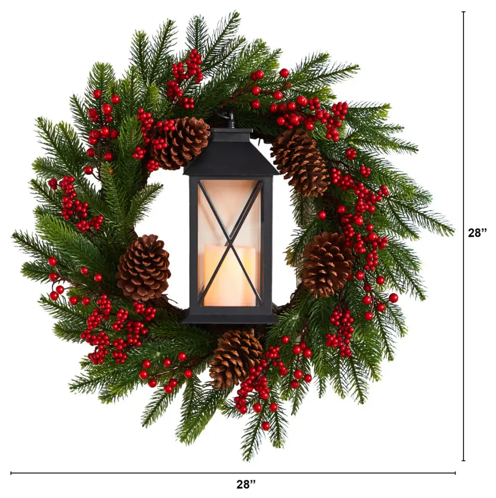28" Berries And Pine Faux Christmas Wreath With Lantern And Included Led Candle