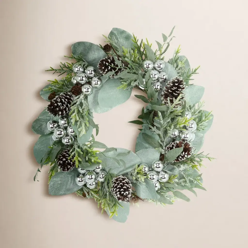 Want to feel nostalgic for Christmas? If you love Christmas but want a trendy alternative to the classical wreath, this half wreath is a better choice. Soft, hued evergreens are accented by pinecones and white berries. Crafted from high-quality materials, this faux wreath will last a while. With a diameter of 28", house in a door or lonely wall. Hang close to the Christmas tree for a magical look. 28" Christmas Pine, Eucalyptus, and Berries Metal Circlet Artificial Wreath