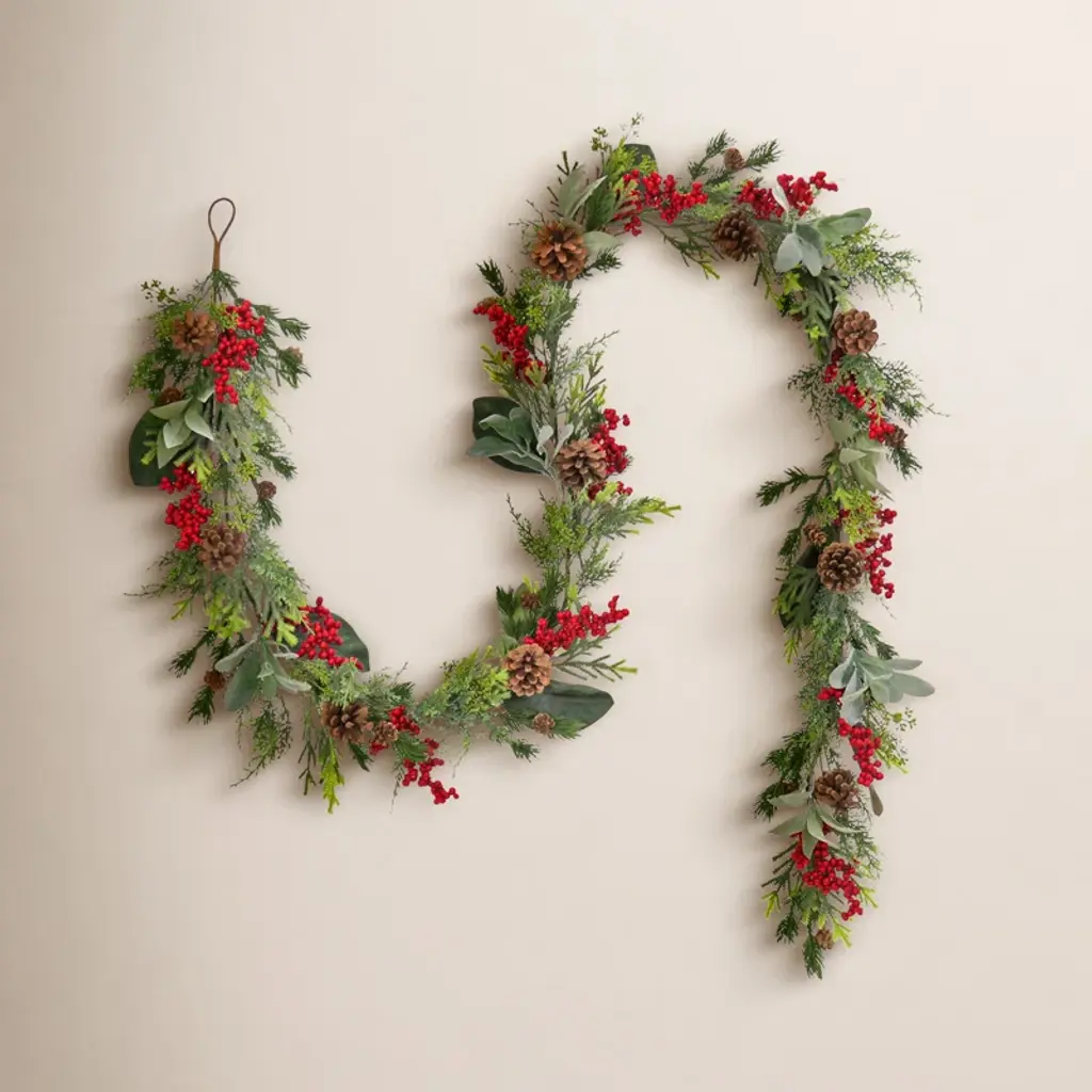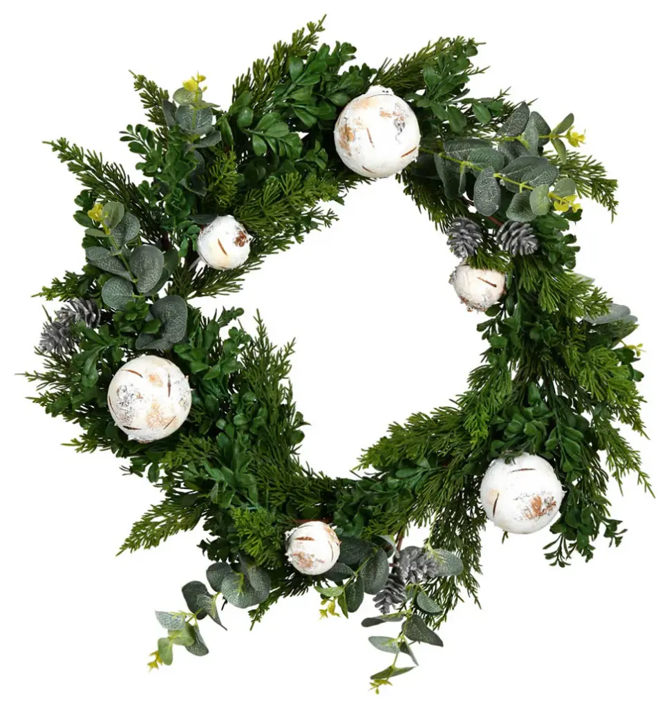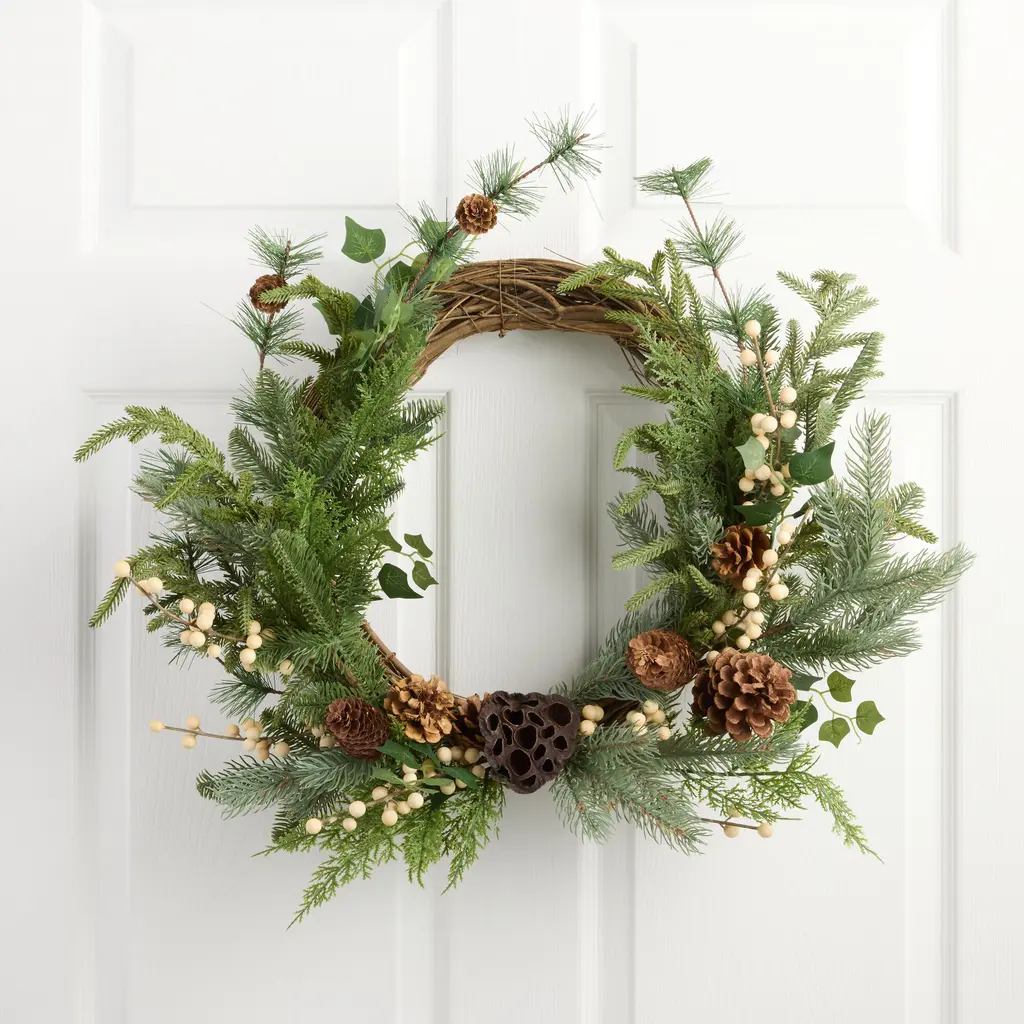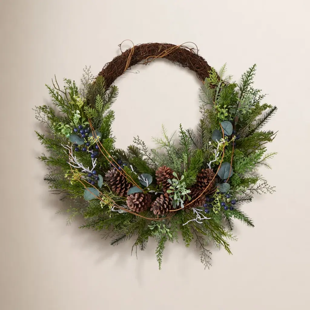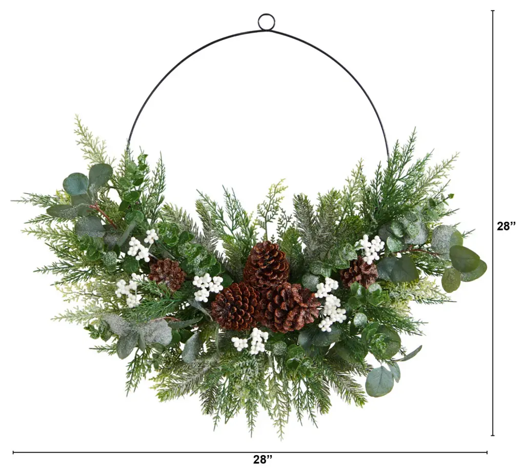 Want to feel nostalgic for Christmas? If you love Christmas but want a trendy alternative to the classical wreath, this half wreath is a better choice. Soft, hued evergreens are accented by pinecones and white berries. Crafted from high-quality materials, this faux wreath will last a while. With a diameter of 28", house in a door or lonely wall. Hang close to the Christmas tree for a magical look. 28" Christmas Pine, Eucalyptus, and Berries Metal Circlet Artificial Wreath