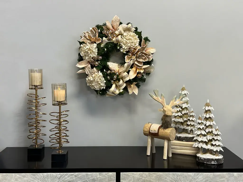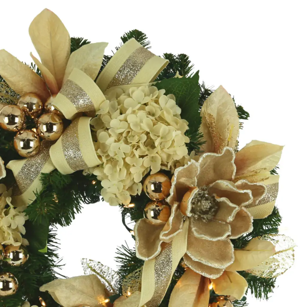 Welcome the spirit of the holiday season into your home with this magnificent, handcrafted LED Lighted holiday wreath. Our artificial evergreen wreath is adorned with dreamy gold glitter magnolias, stunning cream velvet leaves, copper ornaments, glitter bows and eye-catching LED lights to bring a sparkle of joy to your festivities. It offers the look of an evergreen wreath without any of the upkeep. That means you don''t have to worry about cleaning up those pesky pine needles and you can use it year after year. Our wreath can be used indoors or outdoors on a protected covered porch. Handcrafted in the United States.