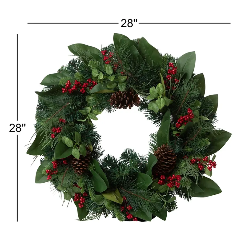 Capture the magic of the season with our Magnolia Leaf and Winter Foliage Wreath—a lush and elegant 28” holiday accent designed to bring warmth and charm to your home. Rich magnolia leaves blend seamlessly with evergreen sprigs, pinecones, and pops of festive red berries, creating a sophisticated, nature-inspired look. Whether displayed on a front door, above a mantel, or as a table centerpiece, this wreath offers a classic holiday touch that lasts year after year.