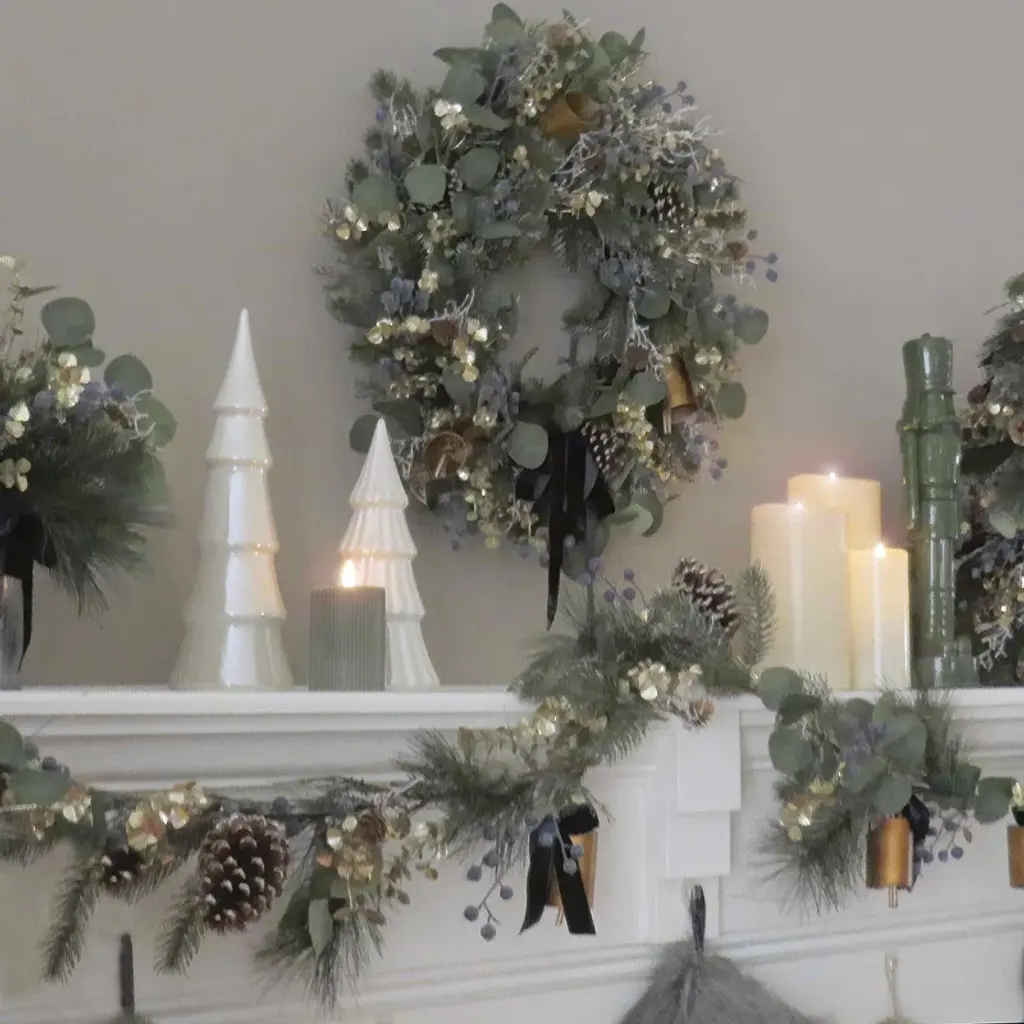This Swiss Chic decorated wreath features a mixture of evergreen and bristle branch tips flowing from a woven branch ring base. It is trimmed with pinecones, leafy greens, white twigs, clusters of blue berries and gold metal bells. A black velvet ribbon and bow add the finishing touch. This colorful and festive holiday wreath can be displayed on door, wall, or window. Indoor use only.
