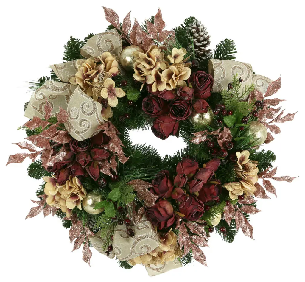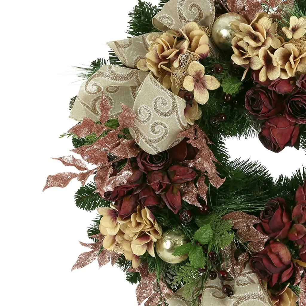 Get into the holiday spirit with this stunning 36" wreath! Perfect for hanging on any door, this handcrafted wreath features a faux evergreen base decorated with burgundy dried roses and gorgeous hydrangeas to make every day feel like a special occasion. Finished with glitter leaves, berries, bows, pinecones and ornaments, it will surely add some holiday cheer to your home this season!