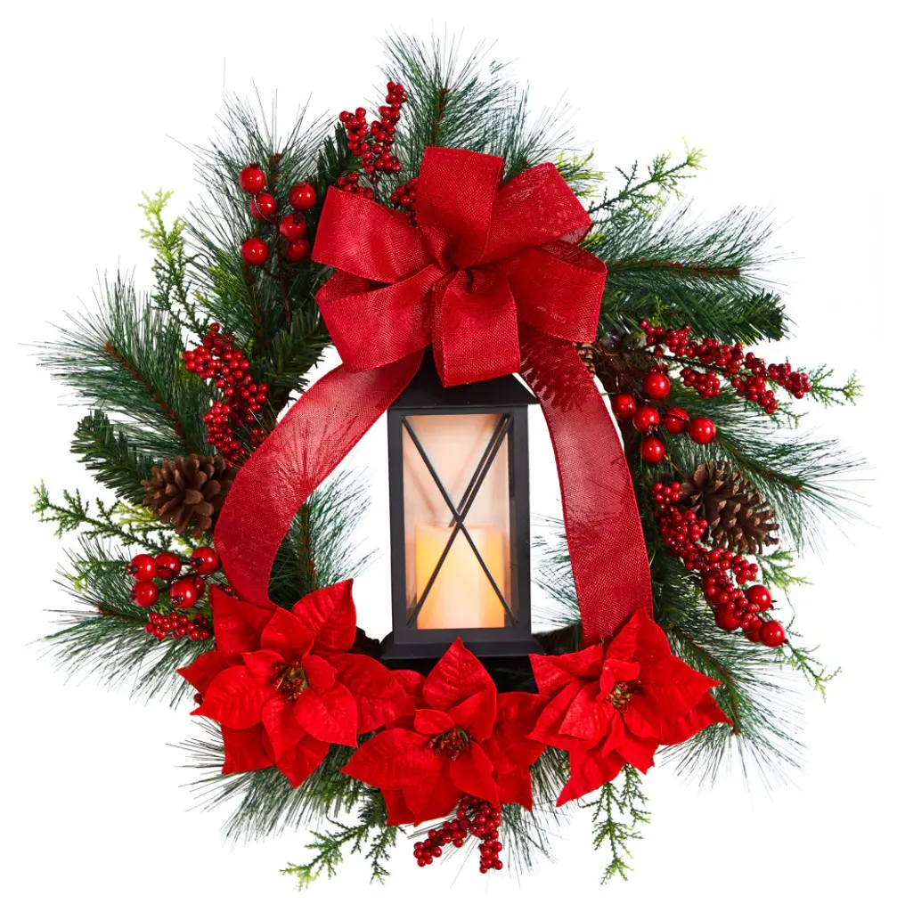 Love wreaths? Take your Christmas decor to the next level with this Christmas lantern artificial wreath. Designed from high-quality materials, evergreens in a counterclockwise motion are accented by pinecones, poinsettia and berries. To make things brighter, a lantern in a dark finish houses an LED candle in the center. With a diameter of 28", set the scene for an intimate night with friends. Illuminate a bare wall. Artificial wreaths are manufactured using synthetic materials, such as polyester material or plastic, and are well designed and constructed to be life-like in appearance. This item will need to be re-shaped when removed from the secure box to allow it to reach its fullest size. Your wreath will look beautiful for years to come; simply wipe clean with a soft dry cloth when needed.