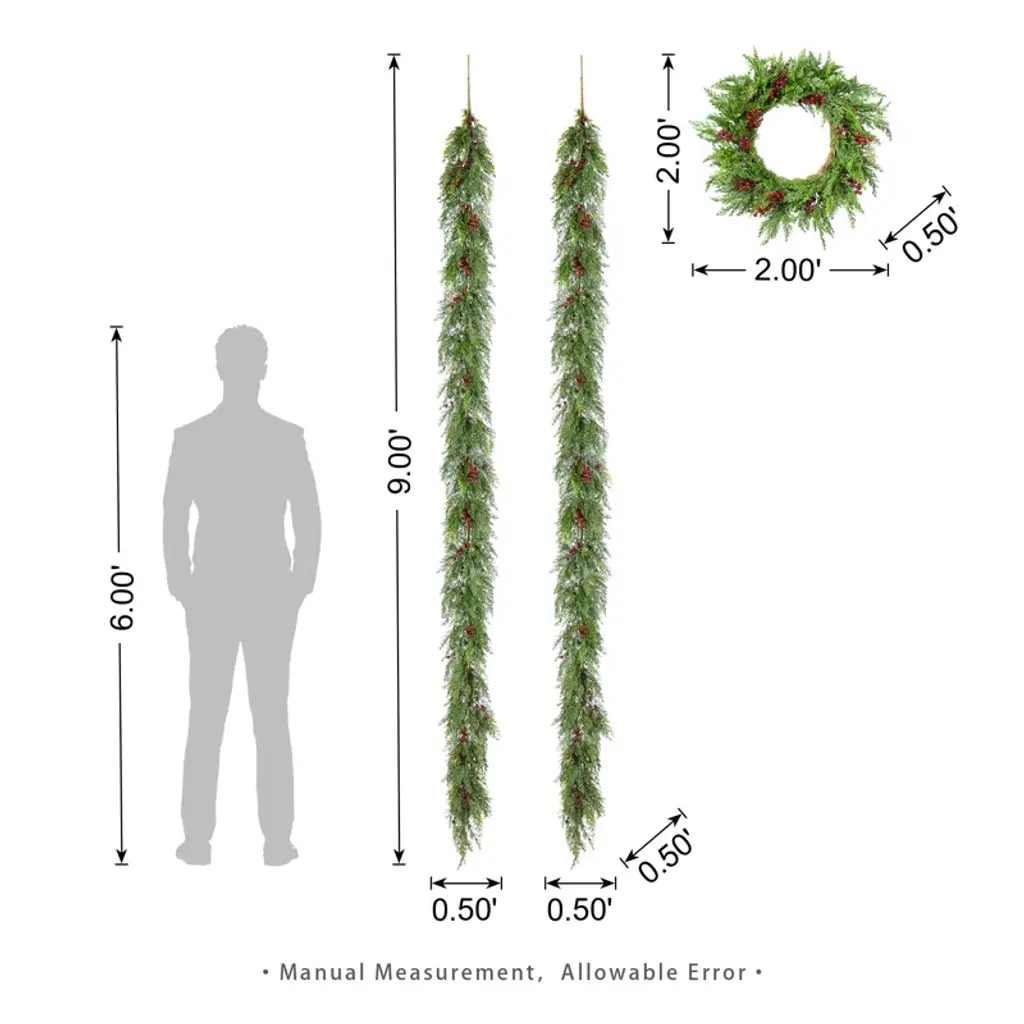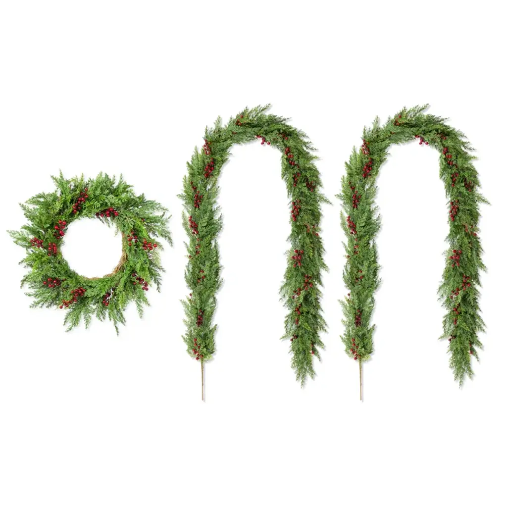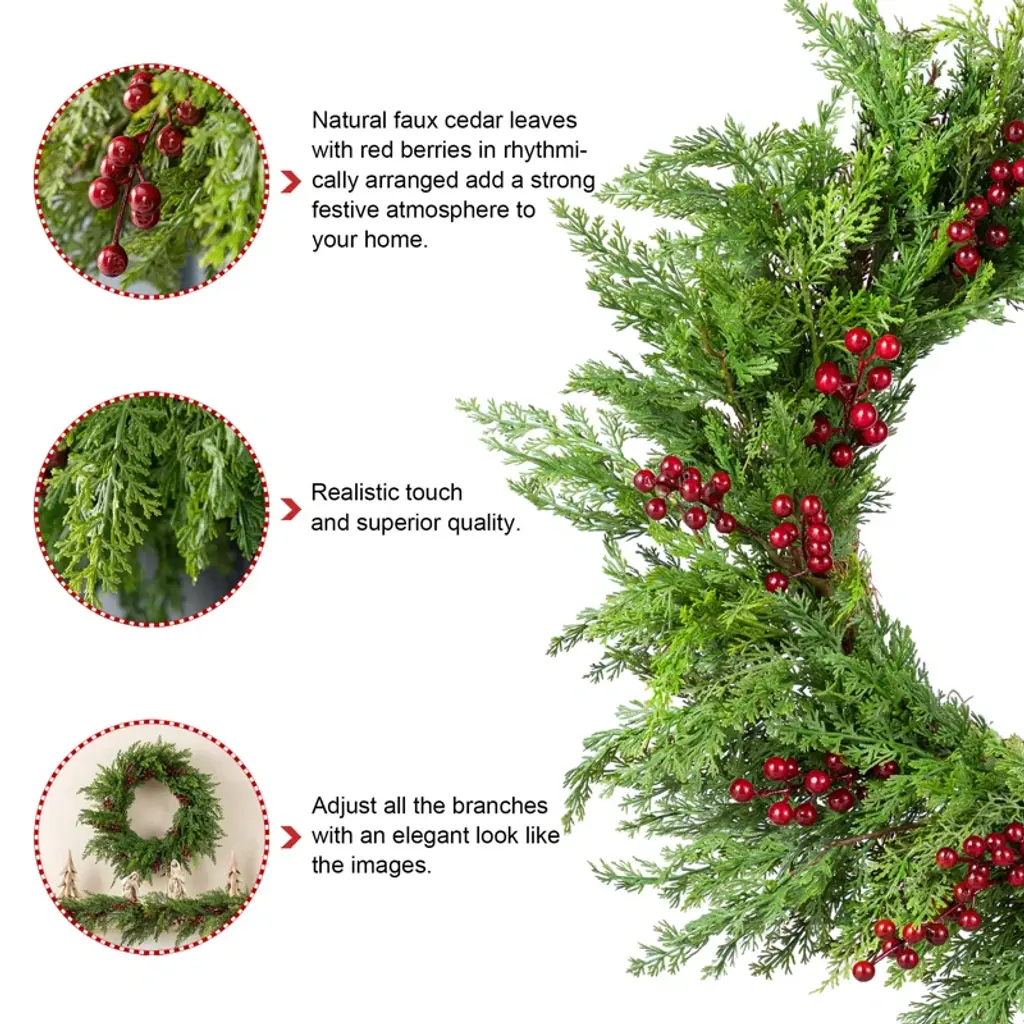 The set of tree 24"D Christmas Greenery PE Dripping Cedar Wreath and matched 9ft garland(2pcs) feature lush green foliage and clusters of bright red berries, creating a vibrant holiday decoration that adds warmth to any door or wall.
