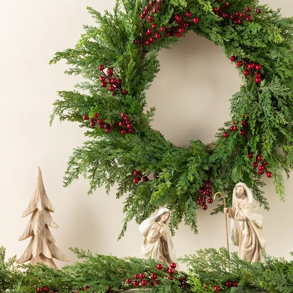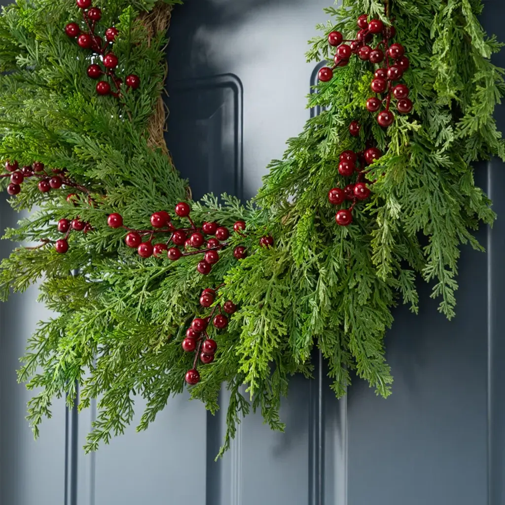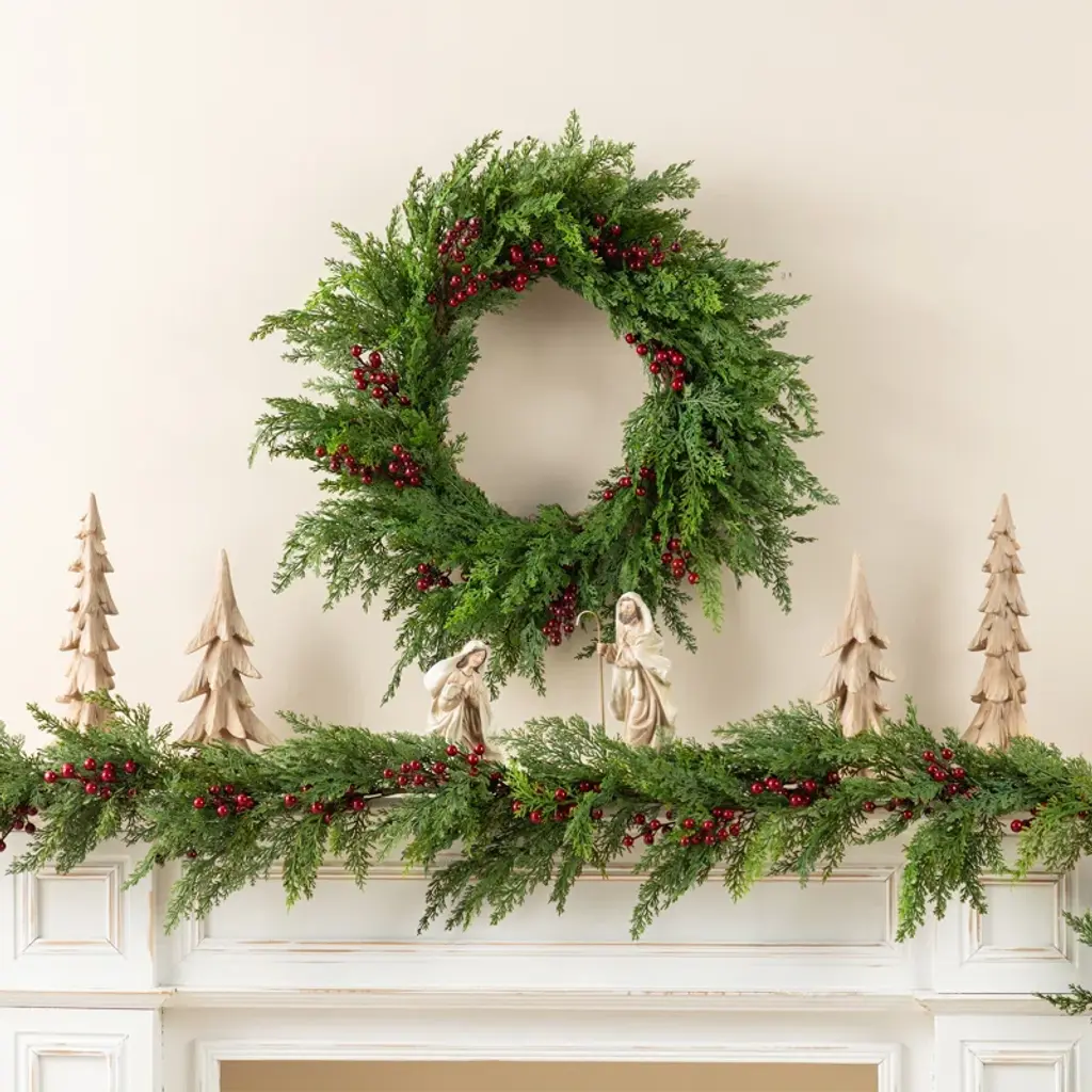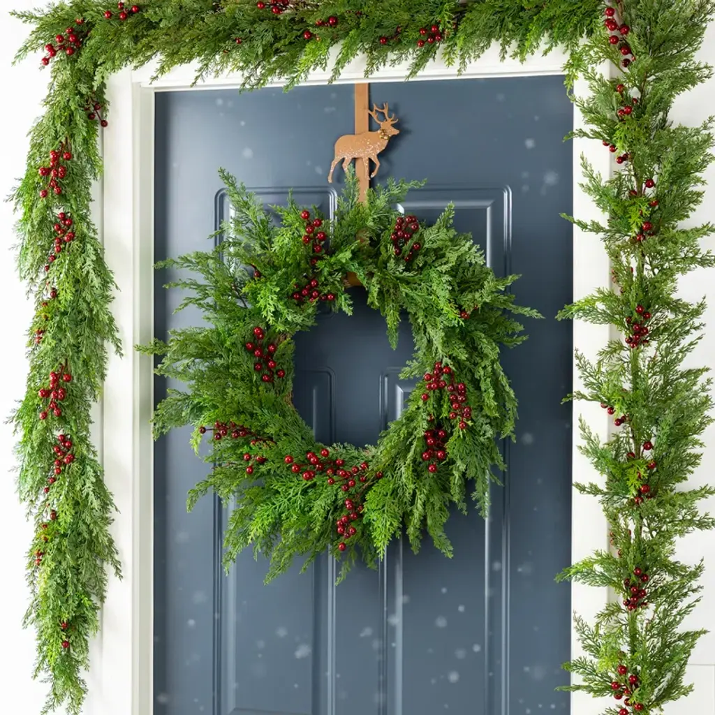 The set of tree 24"D Christmas Greenery PE Dripping Cedar Wreath and matched 9ft garland(2pcs) feature lush green foliage and clusters of bright red berries, creating a vibrant holiday decoration that adds warmth to any door or wall.