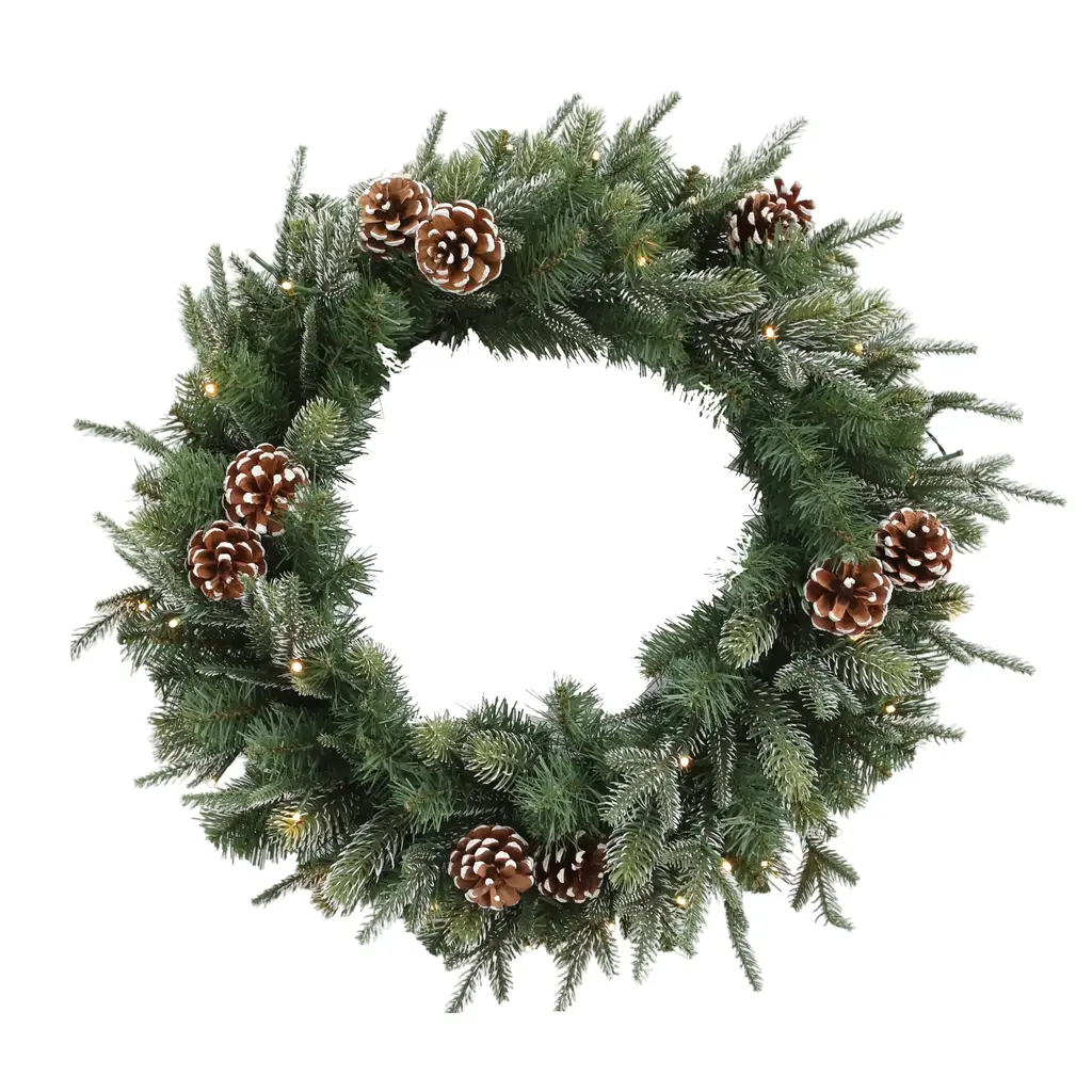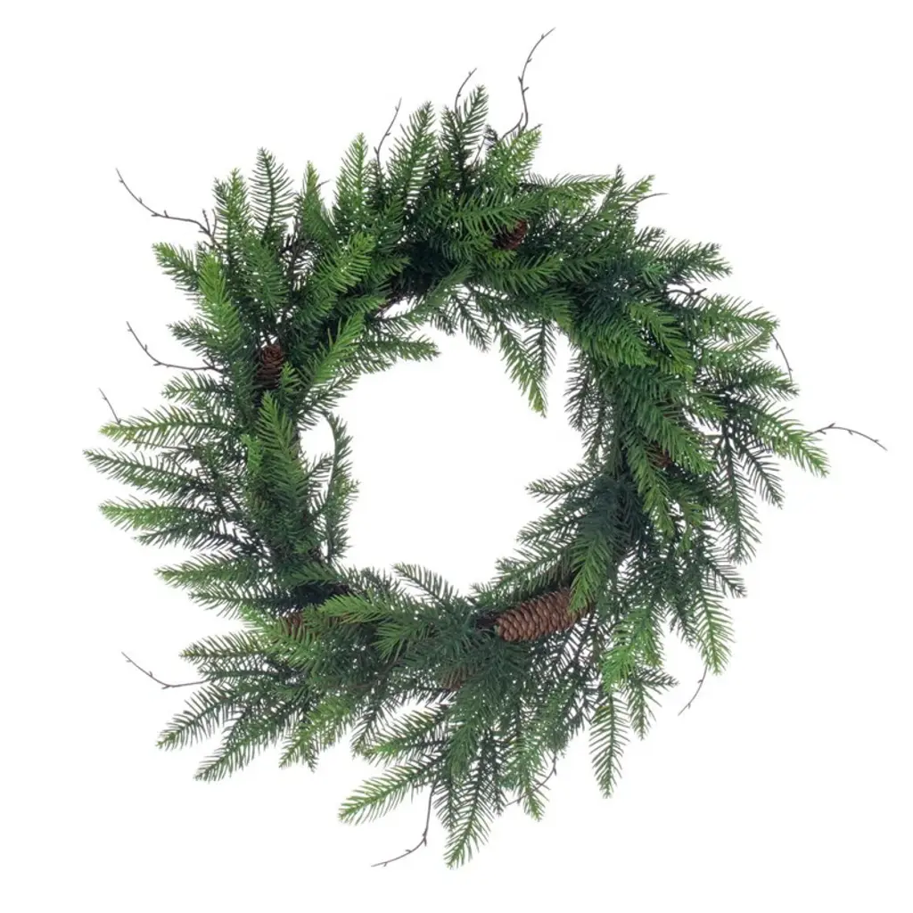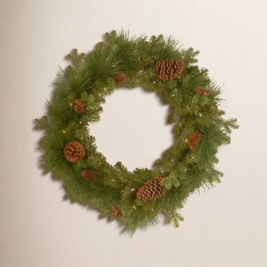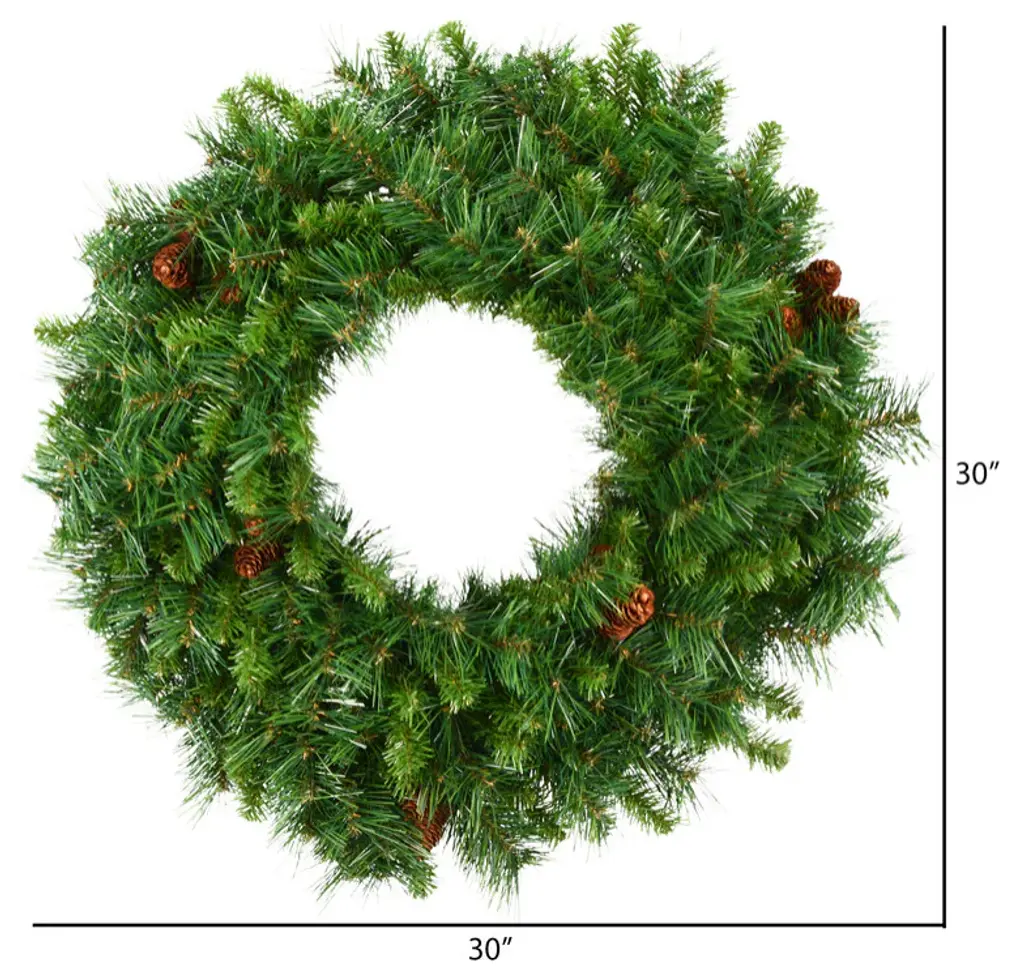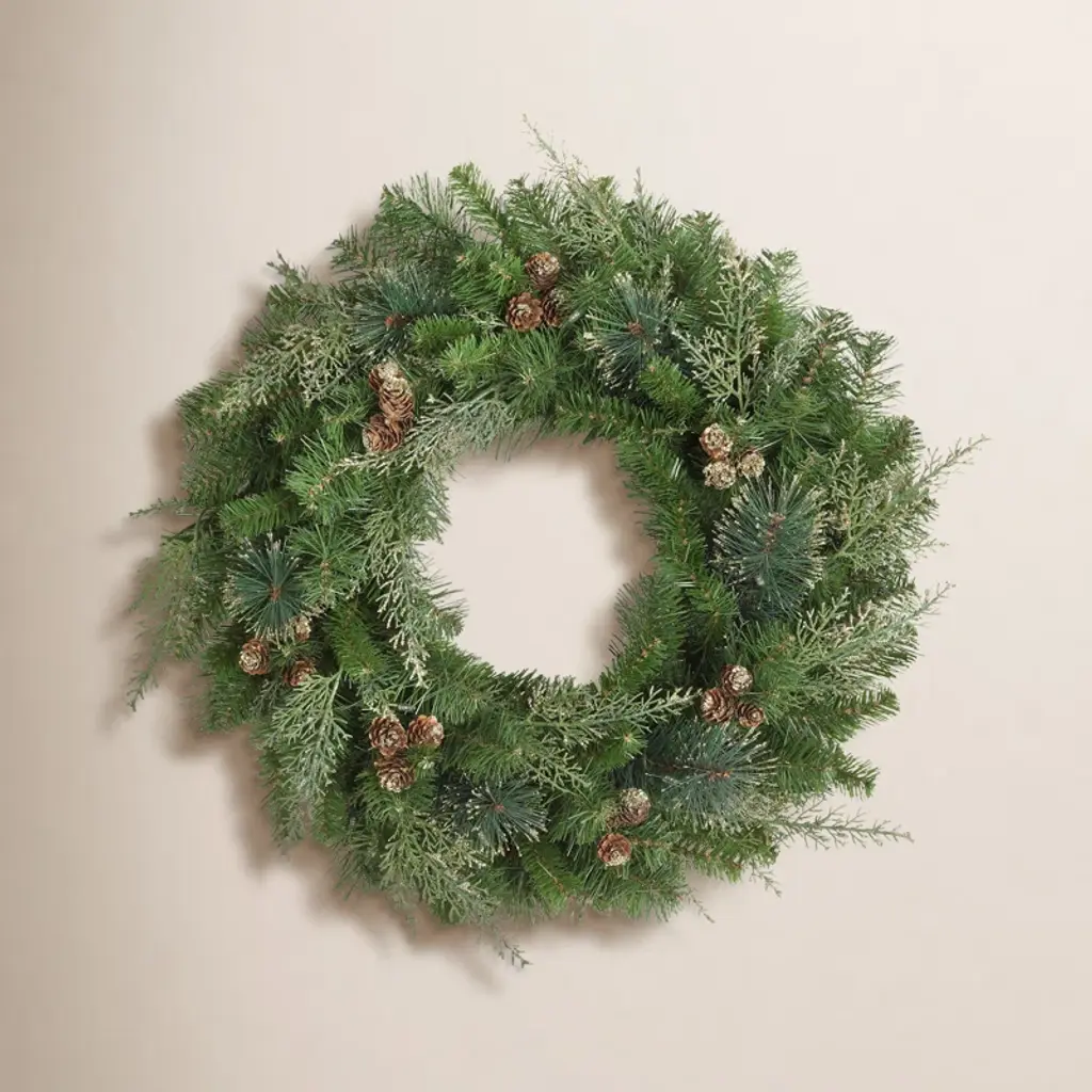 This wreath is elegantly simple and festive with gold glitter accented pine cones placed among mixed pine making it a wonderful addition to your holiday decor | No assembly required "? wreath comes in 1 piece | Metal frame and twig base for hanging | Recommended for indoor use | Dimensions: 8"H x 30"D (measured from outermost tip/edge to outermost tip/edge across the wreath) | Material(s): plastic/pine cone/twig/metal