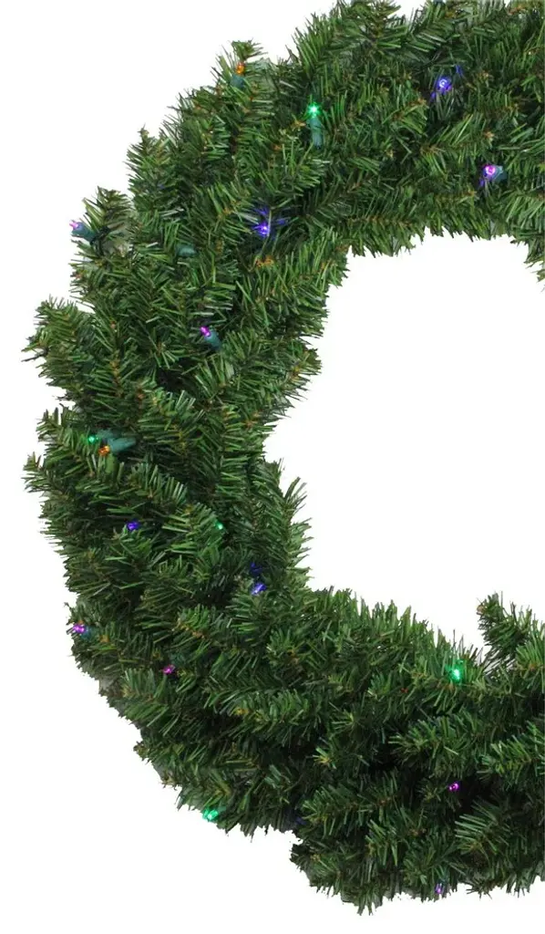 Add this beautiful wreath to your door wall or window for a traditional glow in your holiday decor. Wreath is beautifully accented with a mix of light and dark green tips. Decorate with ornaments garland ribbon or lights or leave plain for a simpler look. Battery operated which allows you to place in many places without fear of being unable to reach outlet. Product Features: Pre-lit with 100 multi-colored LED lights Multi-color consists of green blue red pink and orange bulbs 240 tips 1.25" wide tapered tips Bulb size: concave wide angle Additional Product Features: LED lights use 90% less energy Durable non-glass replaceable bulbs Cool to the touch Super bright bulbs If one bulb burns out the rest will stay lit Lights are equipped with Lamp Lock feature which makes them replaceable interchangeable and keeps them from falling out Requires (3) "AA" size batteries - not included Convenient on/off switch located on battery pack No assembly required "“ wreath comes in 1 piece Includes a heavy duty ring metal frame backing for hanging Comes with replacement bulbs Recommended for indoor use only Dimensions: 30" diameter (measured from outermost tip/edge to outermost tip/edge across the wreath) Material(s): PVC/metal/plastic bulbs/wire