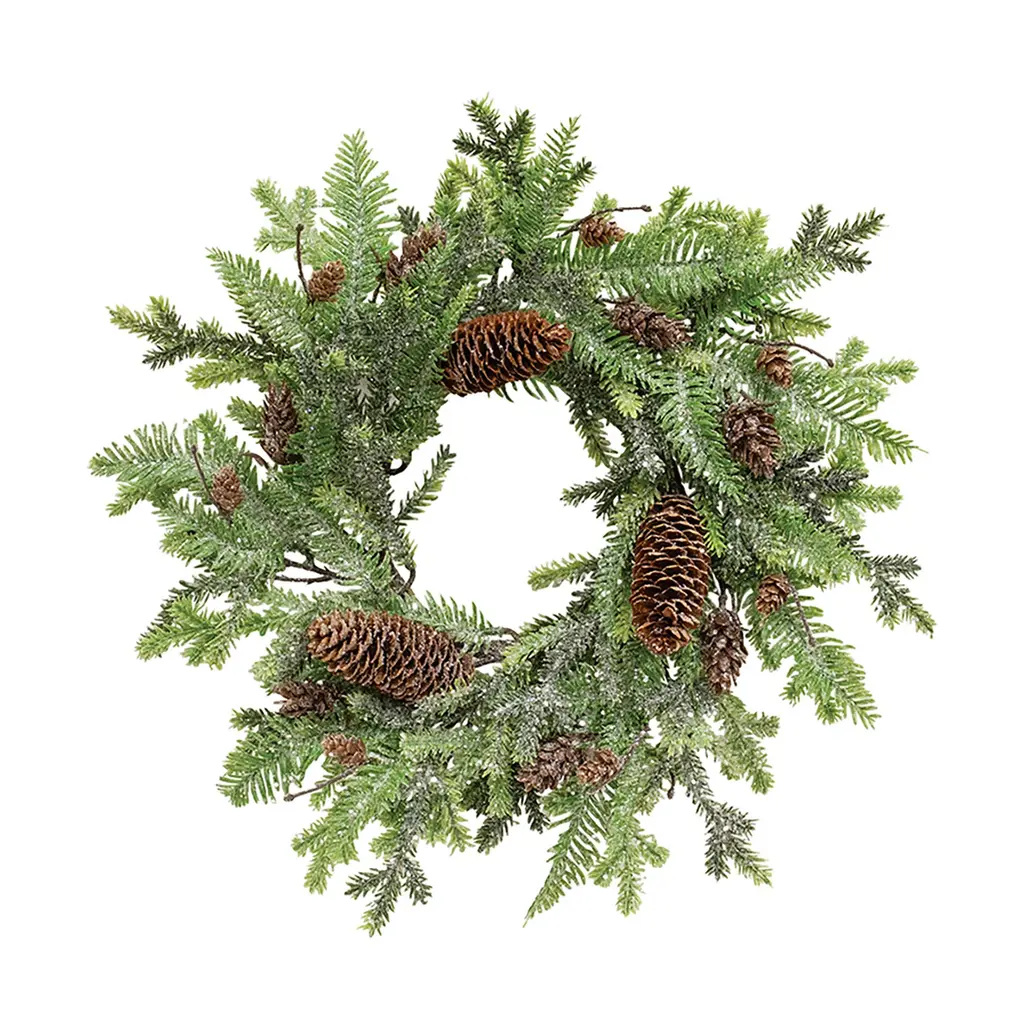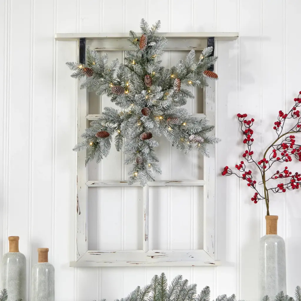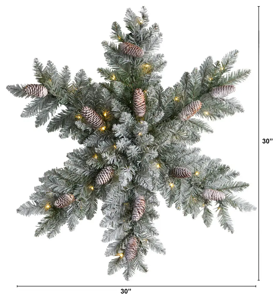 Have some whimsical fun this holiday season with a Pre-Lit Flocked Snowflake Artificial Dunhill Fir Wreath with Pinecones. Be bold and different by displaying evergreens in a star shape inspired by nature that mimics real trees'' foliage and texture. Pre-lit with 40 LED lights that are more energy efficient create a cozy scene with the family. Pinecones adorn the 120 bendable branches for a rustic look. With a diameter of 30in., house in any bare wall or door. Artificial wreaths are manufactured using synthetic materials, such as polyester material or plastic, and are well designed and constructed to be life-like in appearance. This item will need to be re-shaped when removed from the secure box to allow it to reach its fullest size. Your wreath will look beautiful for years to come; simply wipe clean with a soft dry cloth when needed.