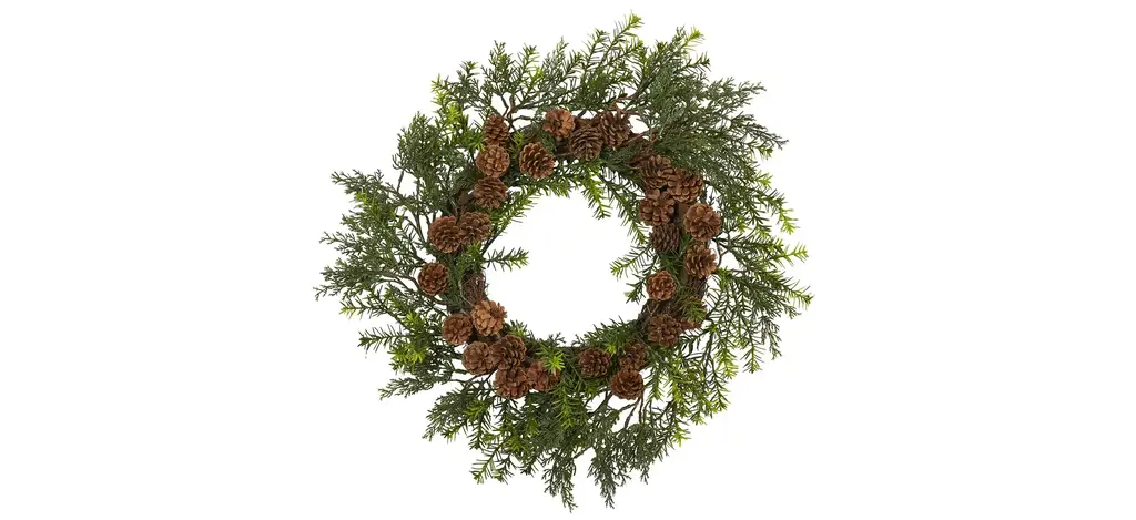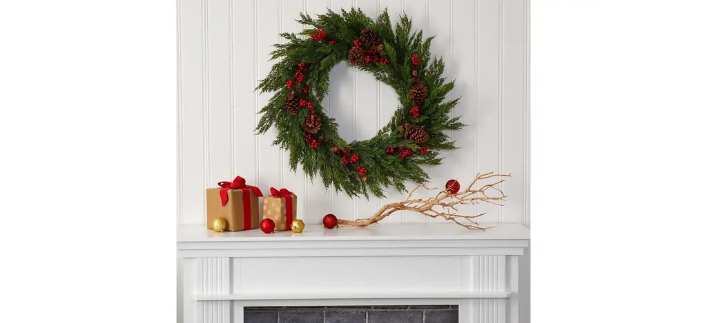 Update your traditional decor accents and add some curb appeal to your home or office entrance with the beauty provided by this artificial wreath intricately designed from realistic looking cypress evergreens, carefully accented throughout with sprays of bright red holly berries and faux pinecones, all of which looks incredibly realistic. Perfect for wall and/or door display in either a home or office environment, this traditional 32" (in circumference) decorative wreath makes for an inviting accent and can undoubtedly help inject front-door appeal all throughout the holiday season.