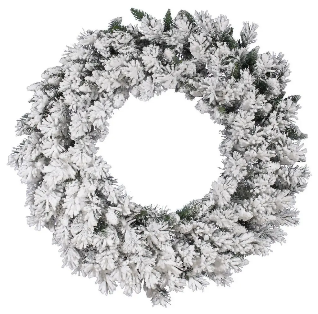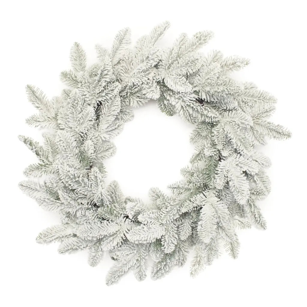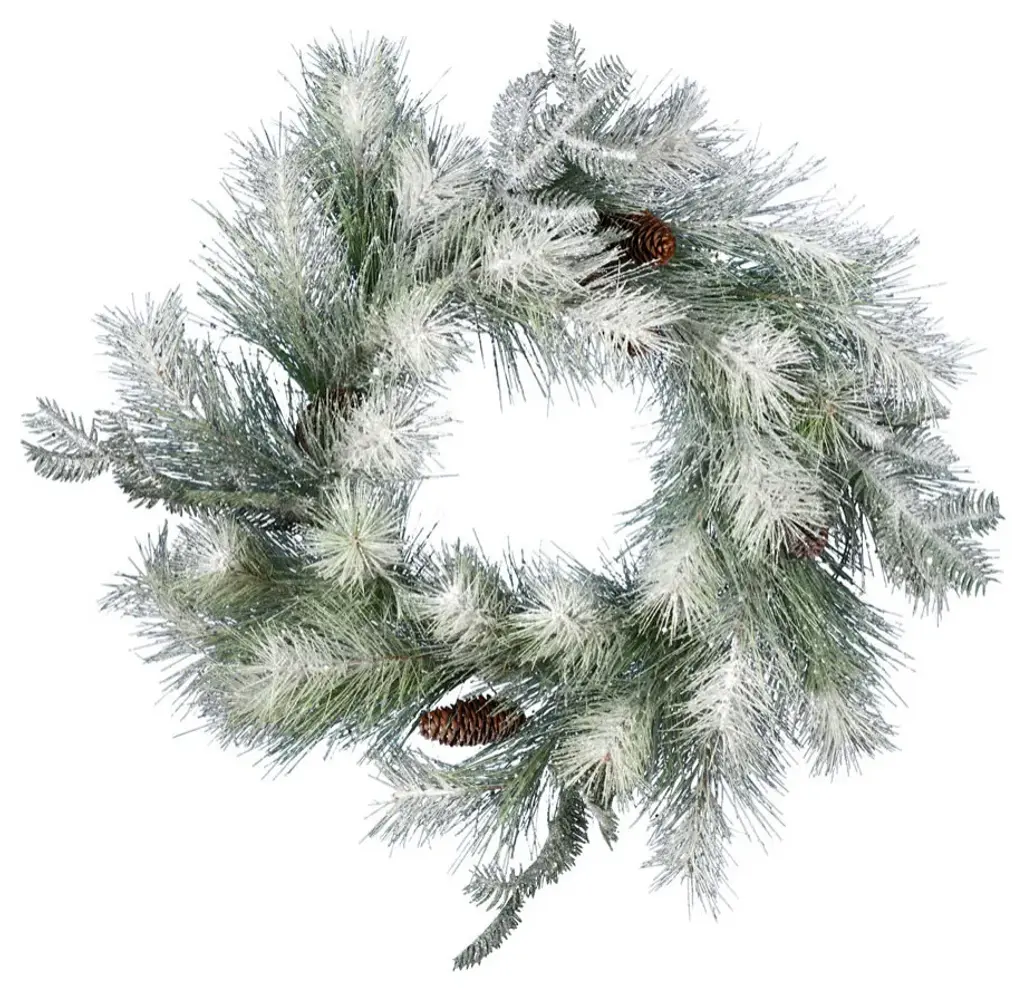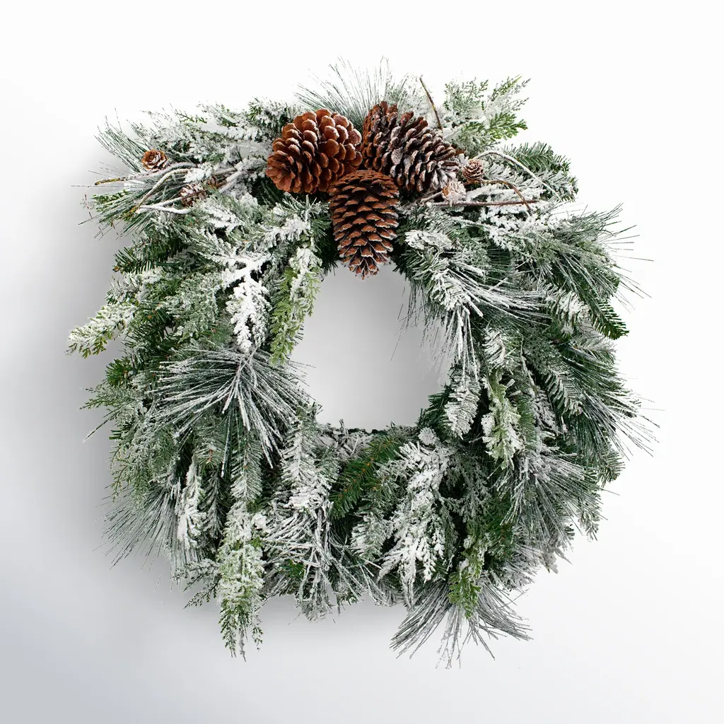 This gorgeous wreath is nothing short of angelic with it''s moderately flocked tips and decorative pine cones Product Features: Unlit 220 tips 0" wide tapered tips For indoor use only No assembly required "“ wreath comes in 1 piece Includes a heavy duty ring metal frame backing for hanging Dimensions: 36" diameter (measured from outermost tip/edge to outermost tip/edge across the wreath) Material(s): PVC/metal