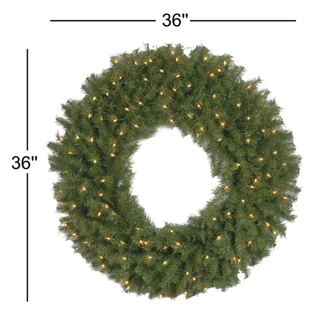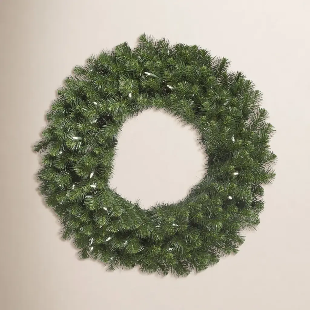 Deck the halls with classic style as you hang up this traditional faux fir wreath. Made to mirror the real thing, the PVC needles stay green all year long. This artificial wreath has a lush appearance and comes pre-strung with incandescent bulbs to cast a warm, welcoming glow anywhere in your home. With a diameter of 3', it's a great option for doors on covered front porches or an open wall over your fireplace mantel. Adorn this festive holiday decor item with bows and pinecones (sold separately) to complete the look.