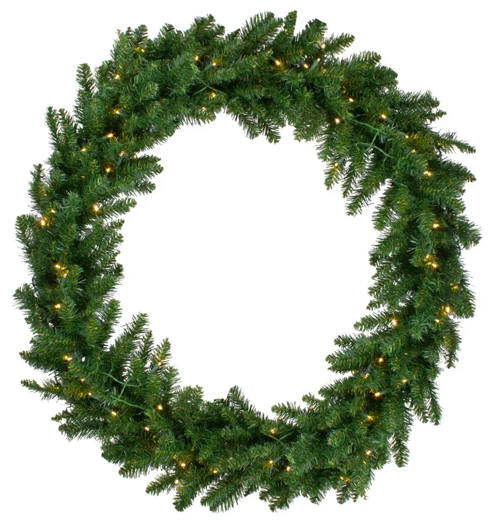 The deluxe Windsor pine features thick two-tone dark green tips which creates a full luxurious lookProduct Features:Pre-lit with 100 clear mini lights330 tips1.5" wide tapered tips28" green lead cordAdditional Product Features:Light sets on the wreath are UL listed for indoor or outdoor use however the wreath itself is recommended for indoor useIf one bulb burns out the rest will stay litLights are equipped with Lamp Lock feature which makes them replaceable interchangeable and keeps them from falling outContains 1 plug with end connector which allows you to stack multiple lighted items together (not to exceed 210 watts)No assembly required, wreath comes in 1 pieceIncludes a heavy metal ring metal frame backing for hangingComes with replacement bulbs and spare fusesWire gauge: 22Dimensions: 36" diameter (measured from outermost tip to outermost tip across the wreath)Material(s): PVC/metal/glass bulbs/wire
