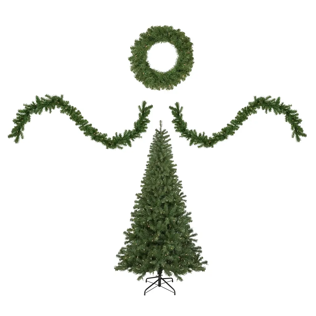 Simplify your holiday decorating this year with our Wolcott Spruce 4-piece set. The set includes co-ordinating artificial Christmas tree wreath and garland pieces. The foliage is a medium green color and all pieces come with clear incandescent mini lights that give your decor a traditional warm glow. Product features of the tree: Pre-lit with 350 clear lights Bulb size: mini Bulb type: incandescent 820 tips 2" wide tips 32" lead cord 44" base diameter (at the widest point) Medium profile tree Hinged branch construction 3-piece easy assembly (including stand) Comes with a FREE black metal tree stand Wire gauge: 22 120 volts 60 hertz .51 amps 61.2 watts Product features of each garland: Pre-lit with 50 clear lights Bulb size: mini Bulb type: incandescent 180 tips 2" wide tips 9" lead cord Bendable wire center allows for you to shape the garland any way you desire Green metal hooks on each end for easy hanging Contains end-to-end connectors which allow you to connect more than 1 garland together (not to exceed 210 watts) Wire gauge: 22 120 volts 60 hertz .17 amps 20.4 watts Product features of the wreath: Pre-lit with 35 clear lights Bulb size: mini Bulb type: incandescent 120 tips 2" wide tips No assembly required - wreath comes in 1 piece Includes a metal frame backing for hanging Additional product features: UL certified and approved for indoor or covered outdoor use If one bulb burns out the rest will stay lit Lights on the tree and garland are equipped with Lamp Lock feature which makes them replaceable interchangeable and keeps them from falling out Dimensions: Tree: 6.5' high (from the base of the stand to the top of the tree) Garlands: 9' long x 10" wide Wreath: 24" diameter (measured from outermost tip to outermost tip across the wreath) Material(s): PVC/metal/glass/plastic/wire Note: Branches are compressed for shipment and need to be fluffed out upon arrival to look like the photo.